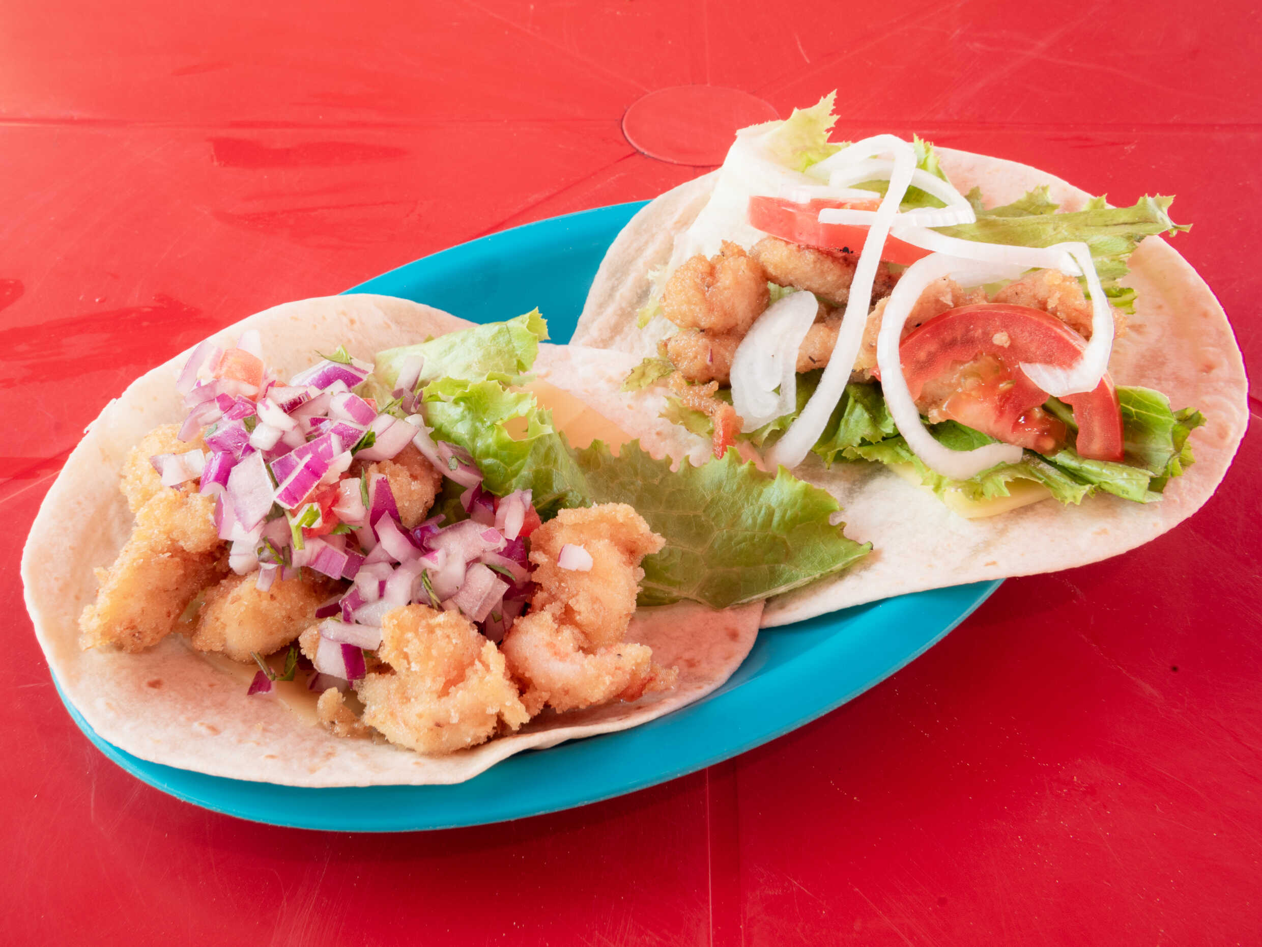 2 tacos de tortilla de harina con nuestros camarones empanizados y queso. Incluye Lechuga, tomate, aderezo de la casa, cebolla y picante aparte.