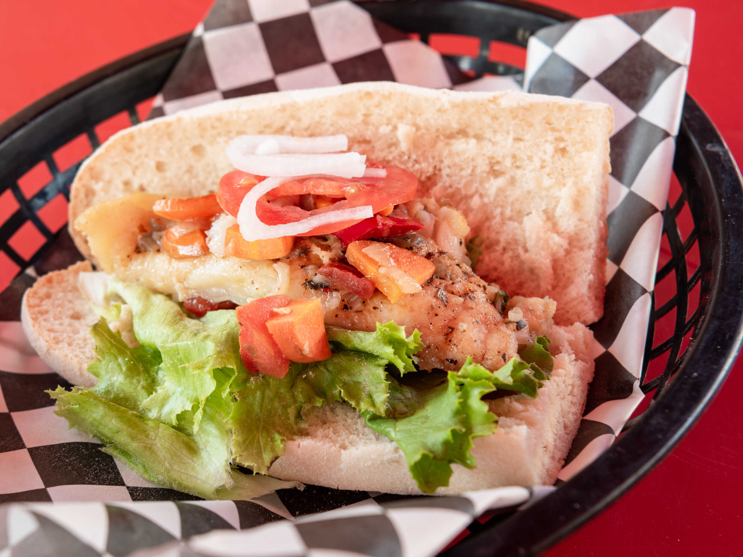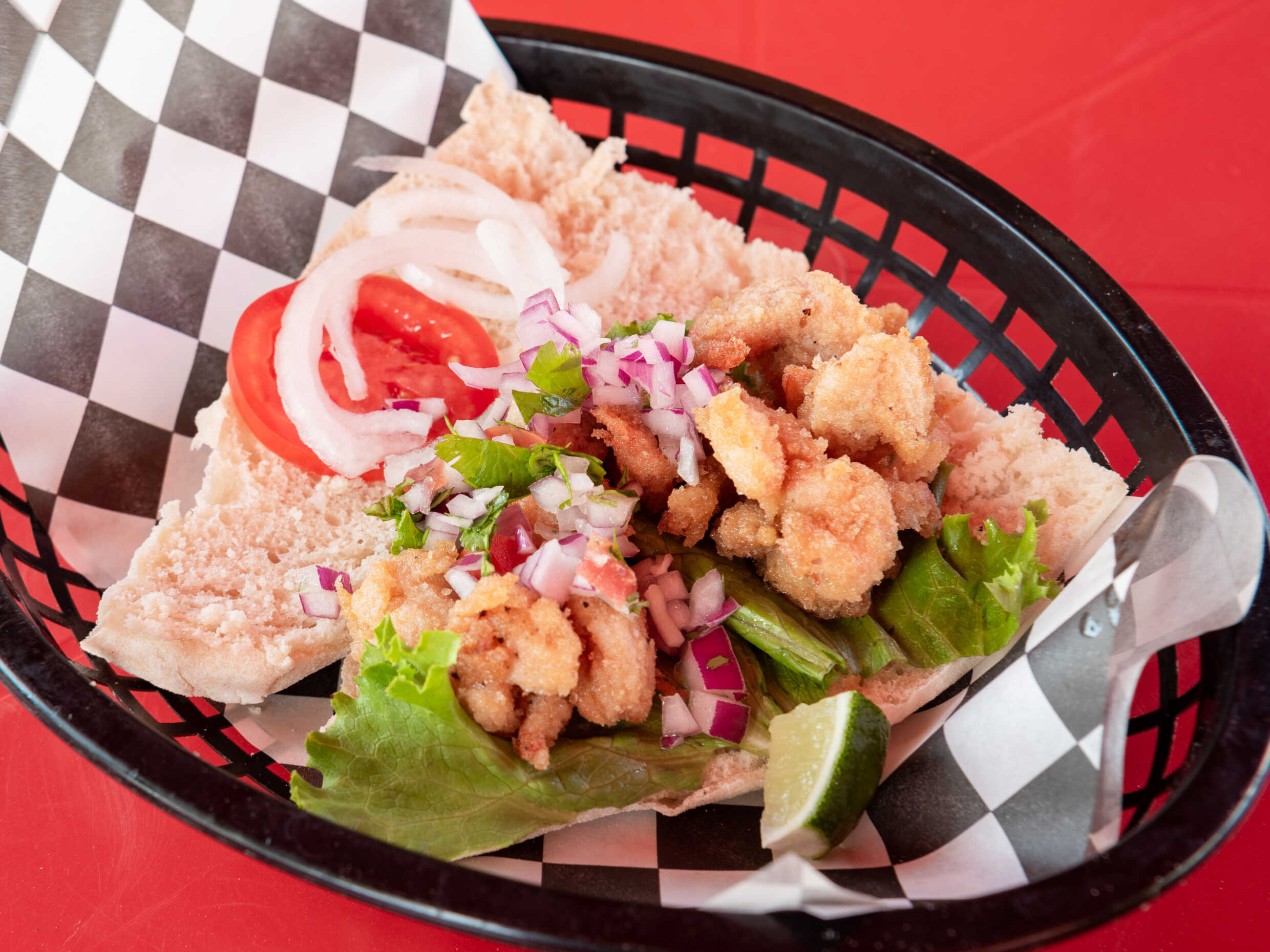 Torta de Camarón empanizado con platano macho. Incluye Lechuga, tomate, aderezo de la casa, cebolla y picante aparte.