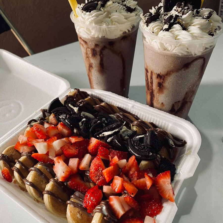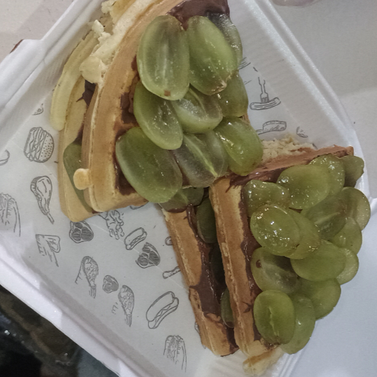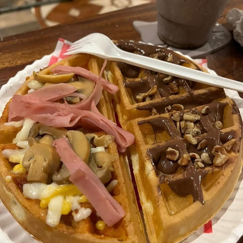 Delicioso waffle belga de 30cm de diámetro mitad Dulce Mitad salado 😋😋 escoge dos ingredientes por lado y disfruta de un exquisito postre