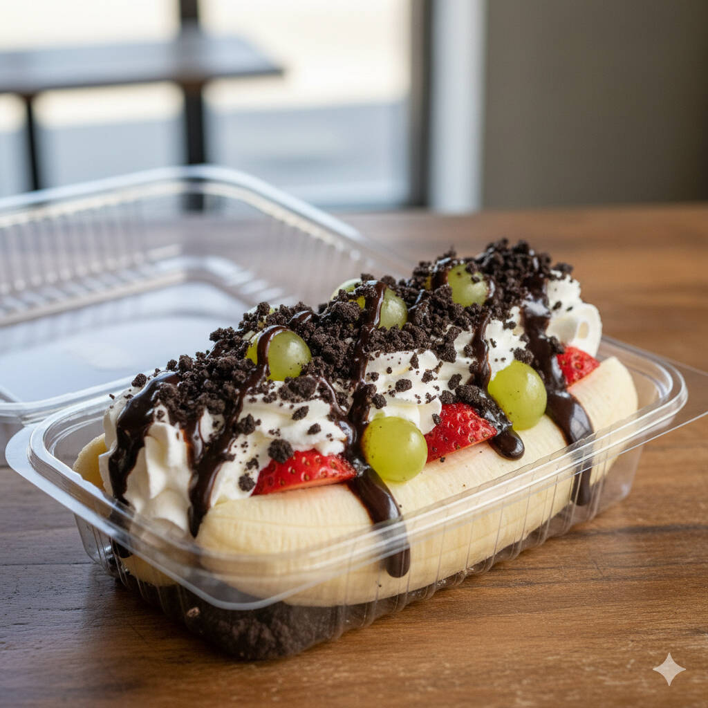 Una combinación de plátano + fresa + uva verde bañado en crema dulce y decorado con Hershey's de chocolate y galleta oreo granulada