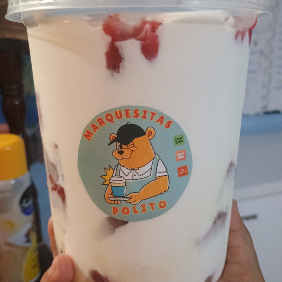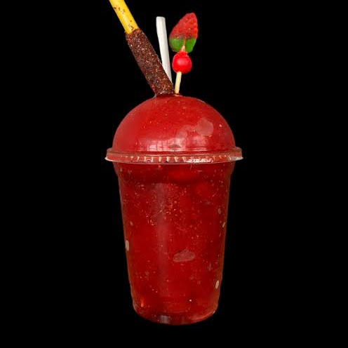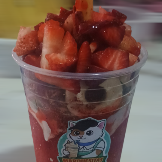 Delicioso vaso 16 onzas relleno de fresas Duero cortadas en cubos y bañadas en una crema dulce adicional; vaso cubierto de un topping + cobertura a elegir en la parte de abajo y de arriba del vaso adicional un chocolate premium a elegir