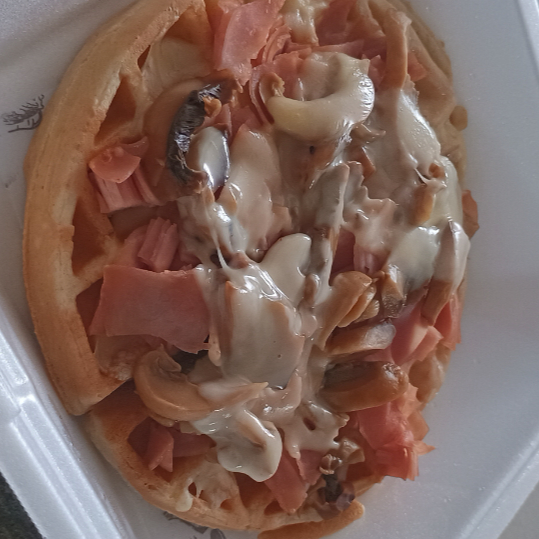 Delicioso waffle belga de 30cm de diámetro bañado queso manchego derretido, jamón y champiñones agrégale una salsita de tu preferencia