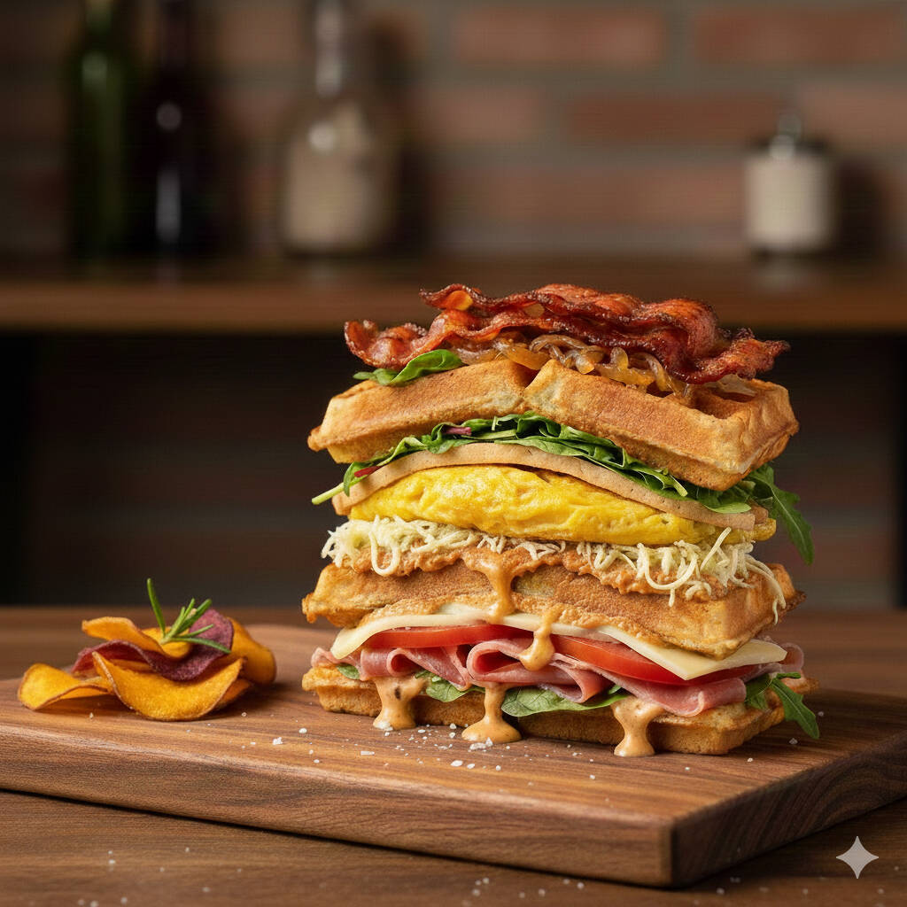 ¡El Club Sandwich que mereces! TRIPLE y totalmente premium. Tres capas de waffle artesanal rellenas a la perfección: Crujiente Tocino Ahumado y Jamón. Doble Queso Fundido: Manchego + Queso de Bola gourmet. Tortilla de Huevo, Tomate, Lechuga y Aderezo Chipotle Casero. ¡Espectacular, abundante y listo para sorprenderte! Acompañado con: Papas chips.