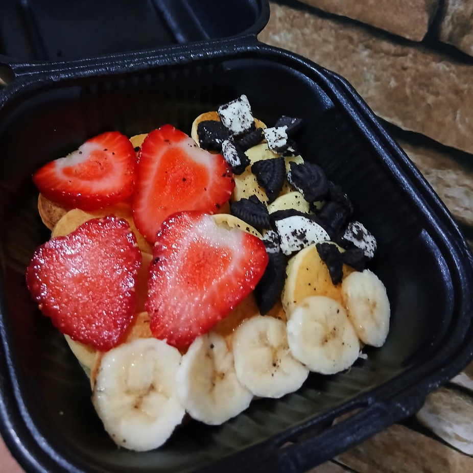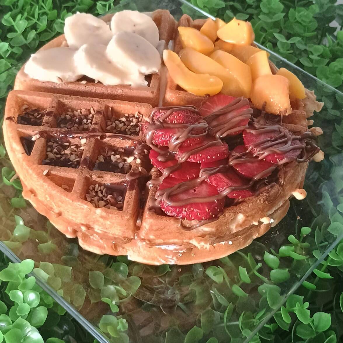Wafle circular de 20cm dividido en 4 triángulos bañado de un topping a elegir adicionado con 2 frutas a escoger