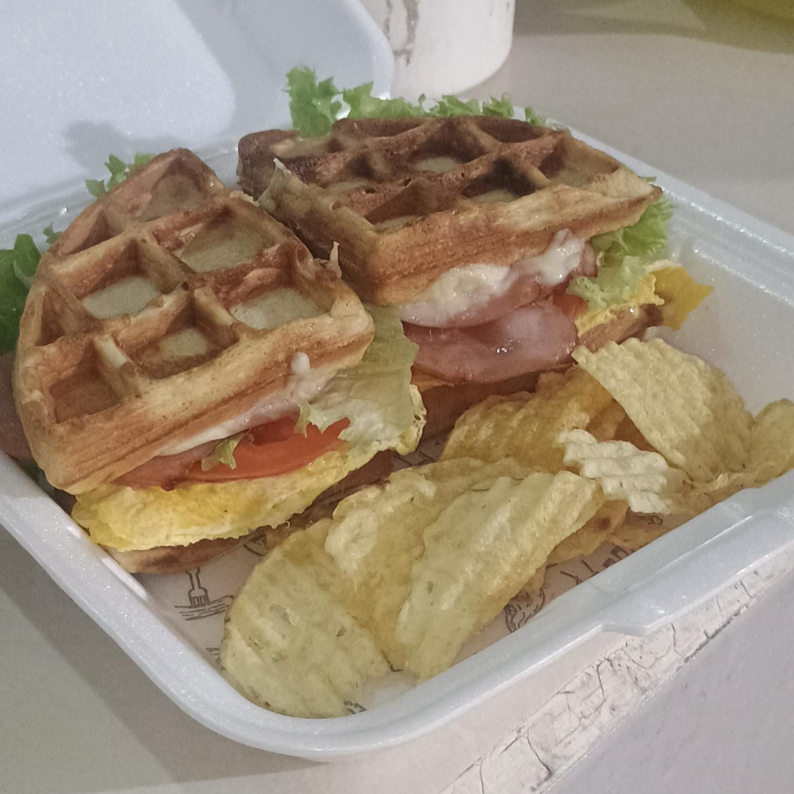 Delicioso Sándwich: capas de wafle recién hechas bañadas en mayonesa chipotle junto con jamón, queso manchego, tocino, tortilla de huevo, lechuga y tomate en rodajas.. adicional una porción numerosa de papas tipo chips ¡Todo un combito llenador!