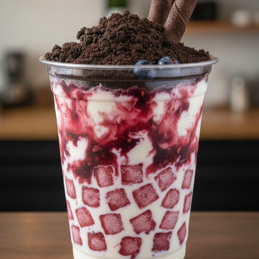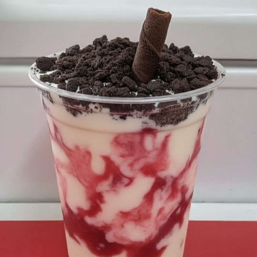 Vaso de 16 onzas relleno de crema dulce y frutos rojos congeladas marca Duero cortada en cubos y encima topping a elegir + un barquillito de chocolate