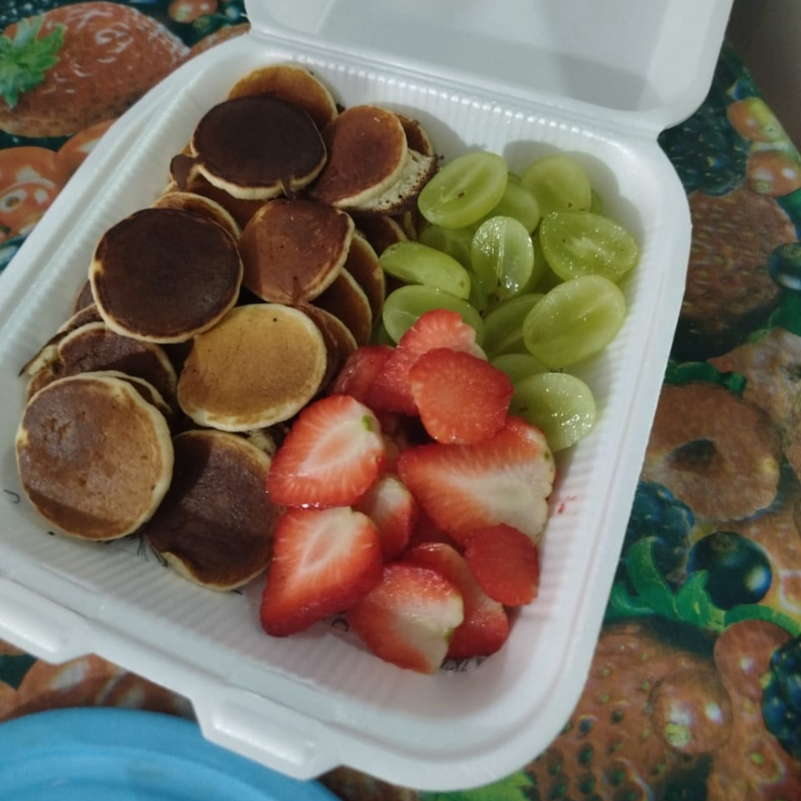 Deliciosa charola de 12 pz de mini hotcakes + 2 frutas a elegir + un topping a elegir