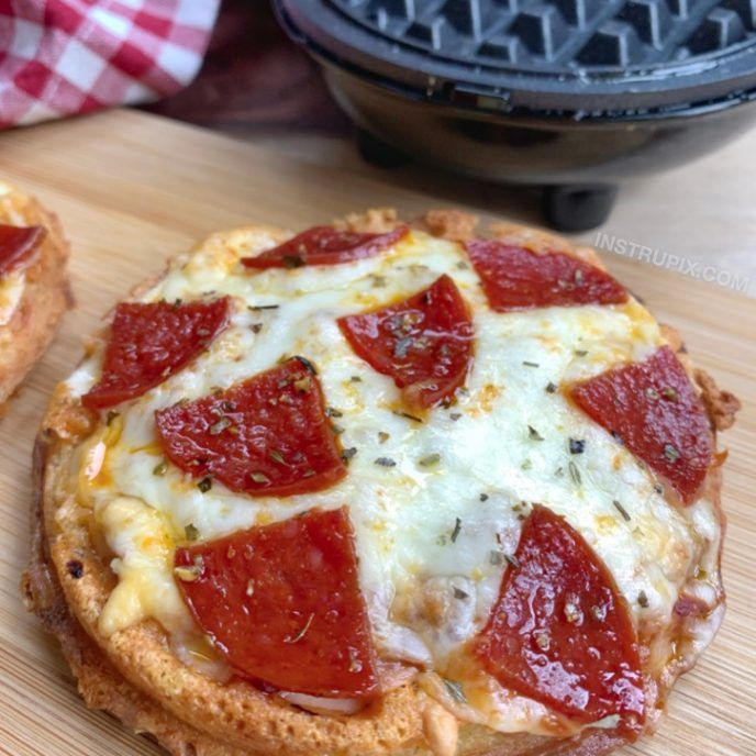Waffle circular de 25 cm de diámetro bañado de una salsa de pizza cubierto de queso manchego peperoni y especias