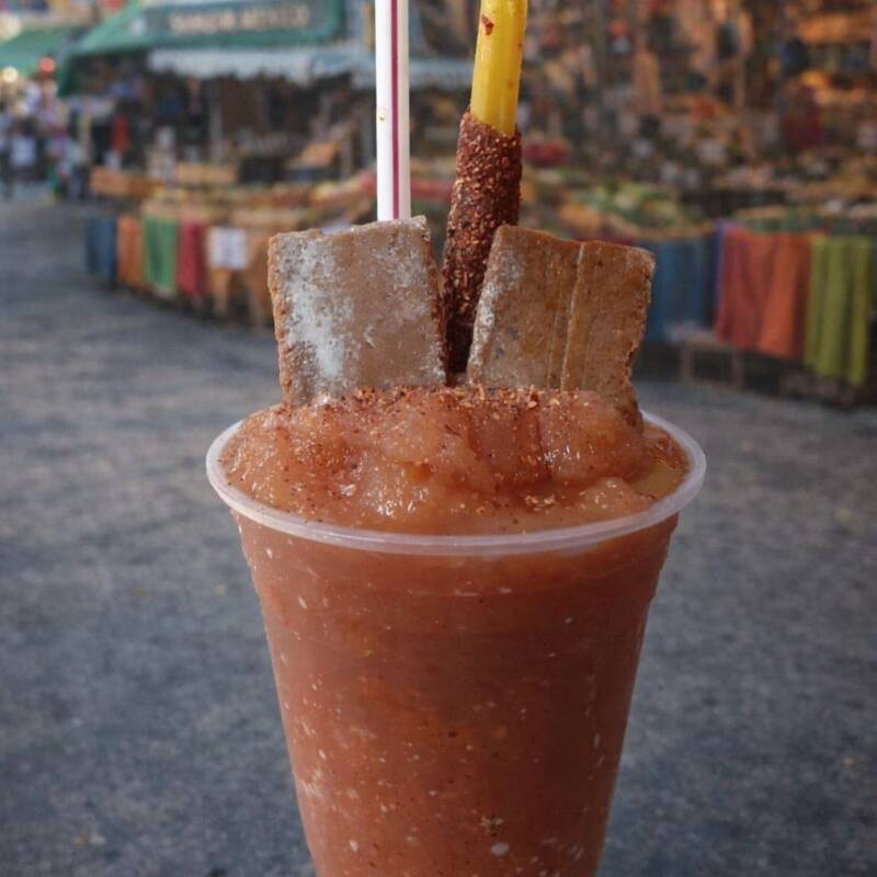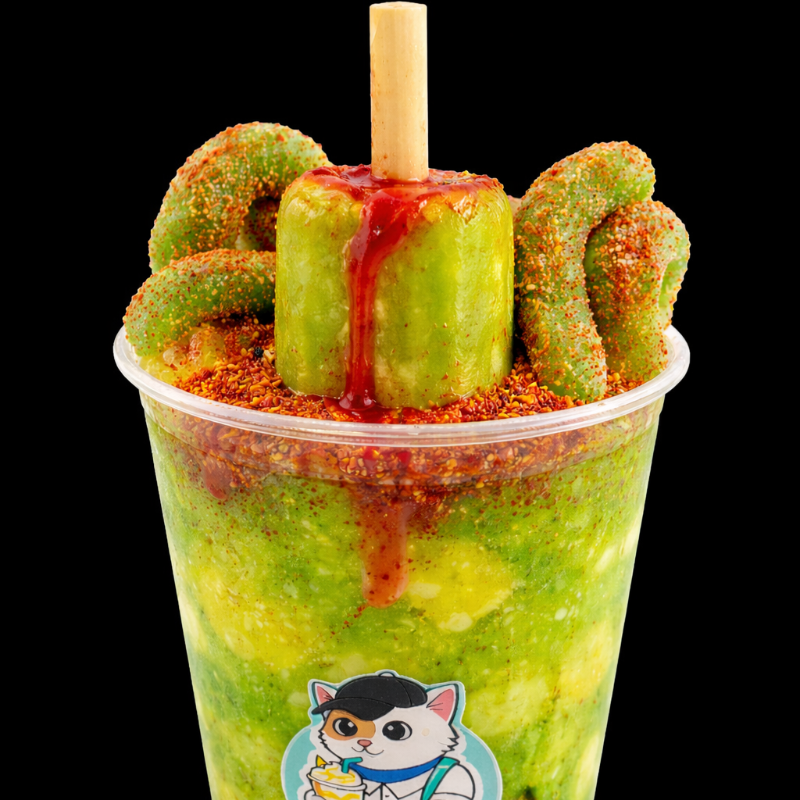 Jugo de caja congelado triturado y combinado con chamoy, chile en polvo, variedad de gomitas, palito de tamarindo picoso y adicional una paleta congelada sabor a Mango con chamoy