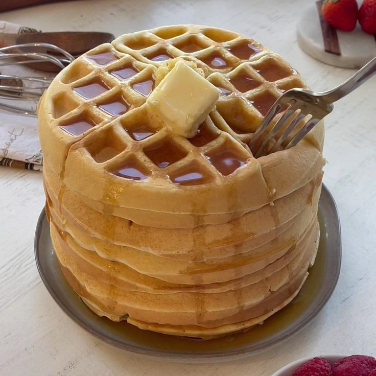 3 pz de waffles naturales jumbo bañados de jarabe de Maple con mantequilla encima