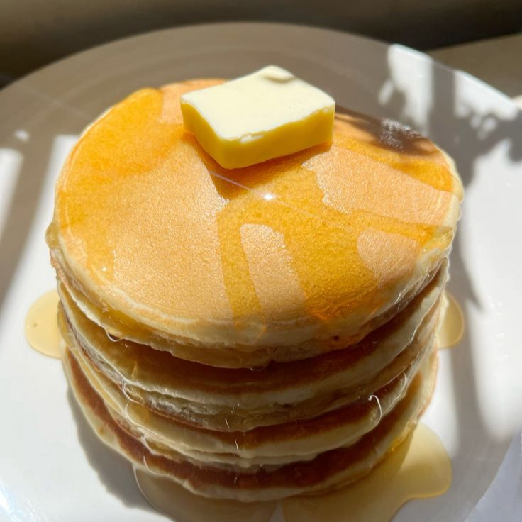 Deliciosas 4 pz de hotcakes estilo panqueques con una decoración de mantequilla y topping de jarabe de Maple 🌟
