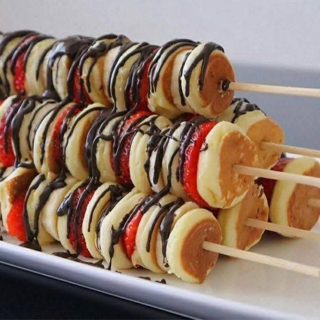 10 pz de mini hotcakes (por Brocheta) + 1 fruta elegir Bañada de una salsa a tu elección