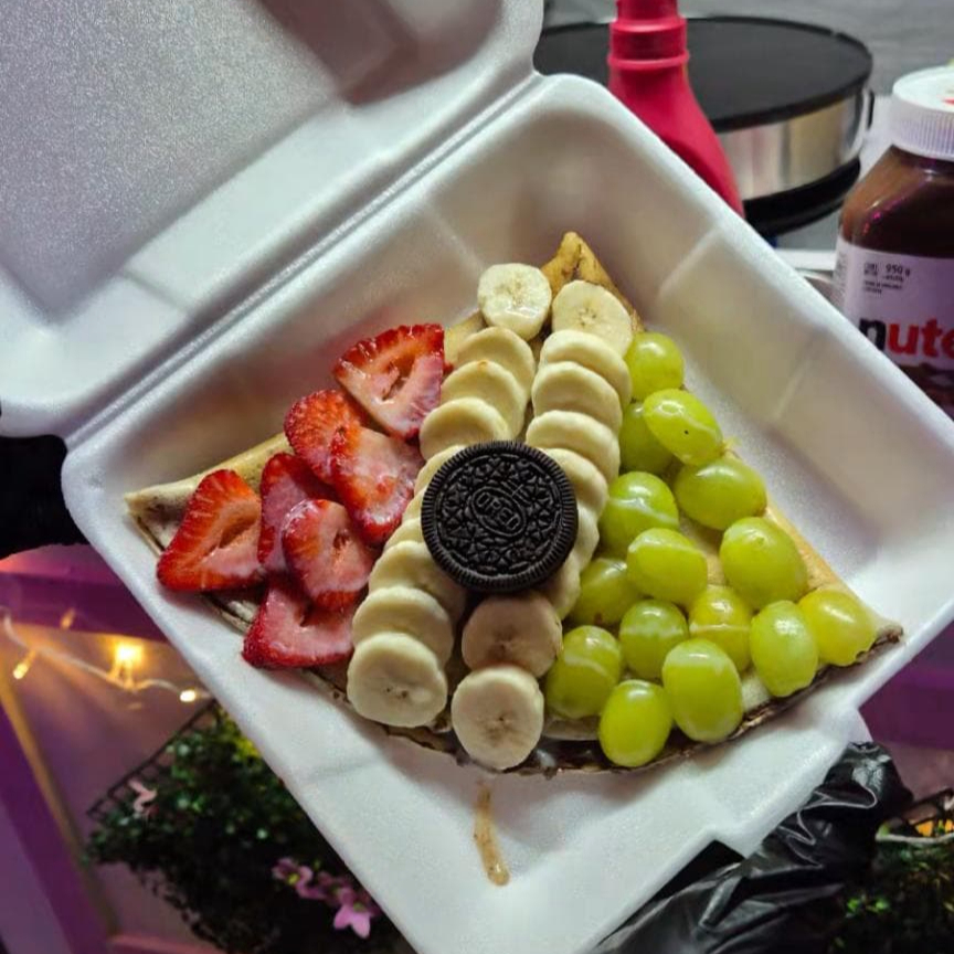 Deliciosa crepa rellena de 1 ingrediente a elegir + encima tres frutas diferentes junto con una galleta oreo