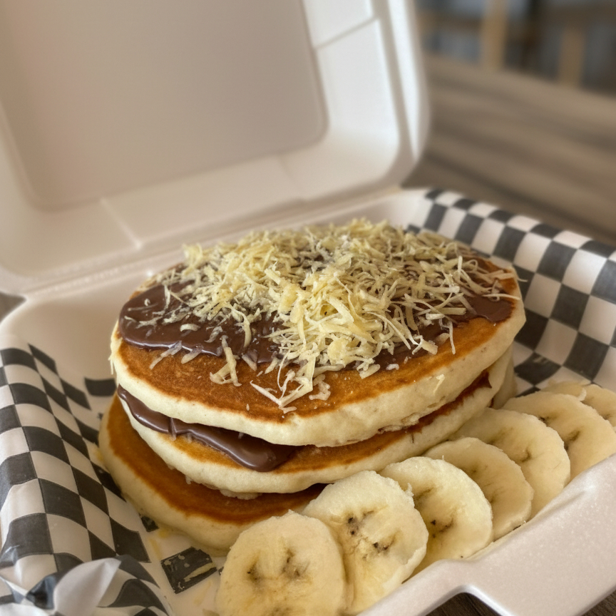 Nuestra torre de hotcakes más atrevida: capas de Nutella y una generosa lluvia de queso de bola rallado, acompañados de rodajas frescas de plátano. ¡Una explosión de sabores que te sorprenderá!