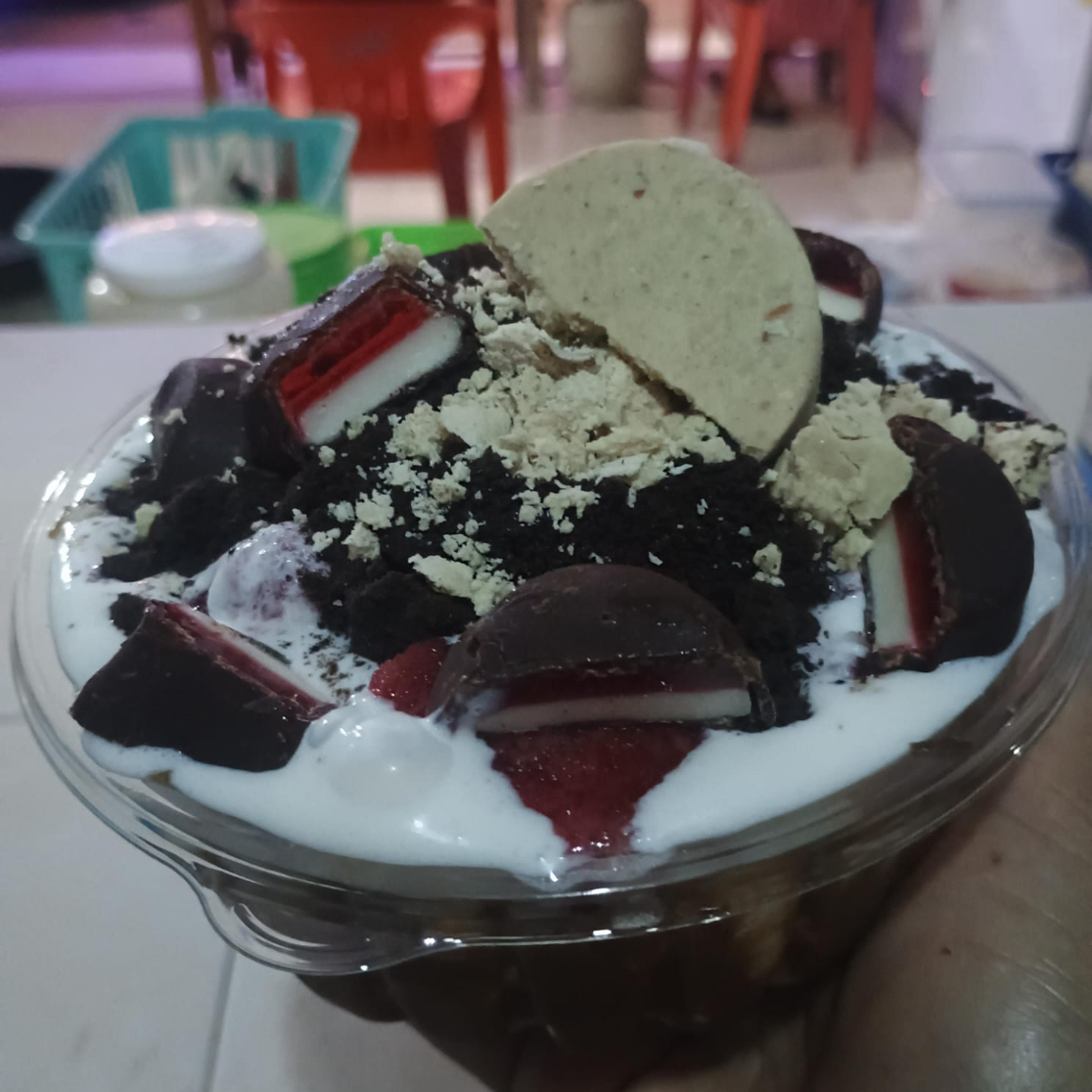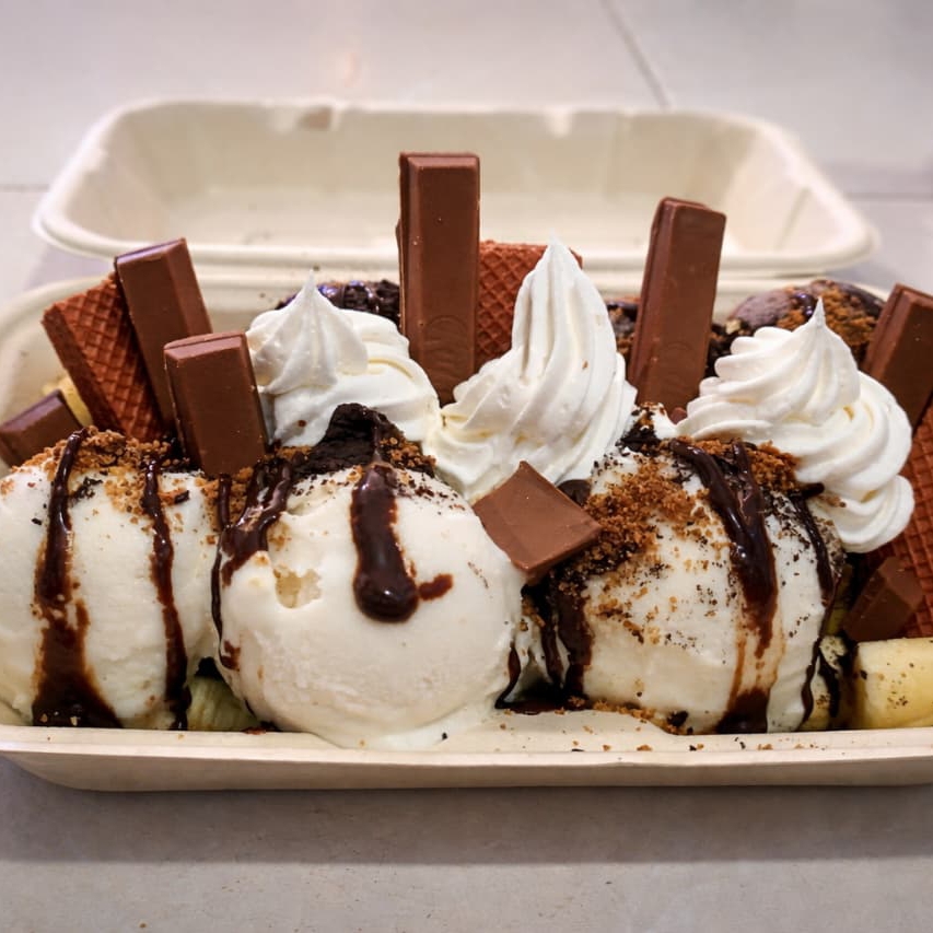 Una mezcla perfecta: helado a elegir, plátano natural, crema batida, galleta triturada a elegir y Hershey’s por encima.