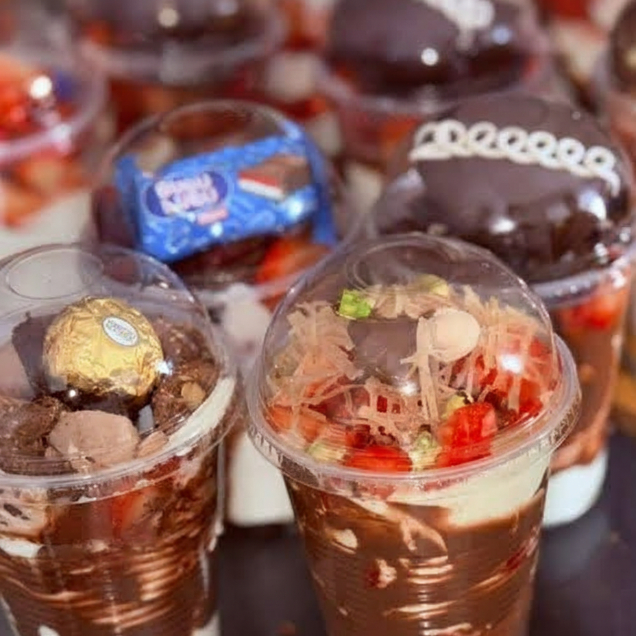 Delicioso vaso 16 onzas relleno de frutos rojos Duero cortadas en cubos y bañadas en una crema dulce adicional; vaso cubierto de un topping + cobertura a elegir en la parte de abajo y de arriba del vaso adicional un chocolate premium a elegir