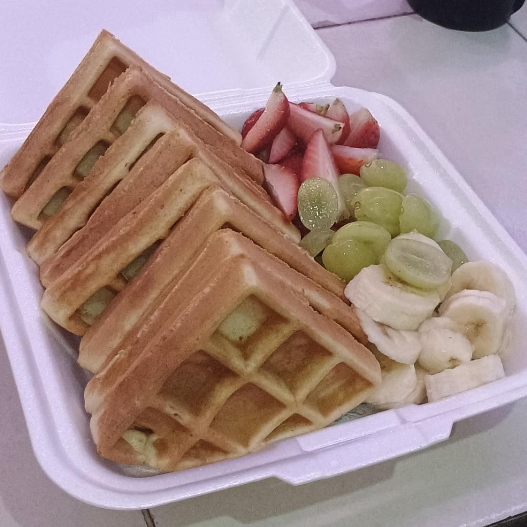 Deliciosos 4 Waffles TRIANGULARES bañado de un topping a elección y adicional una fruta