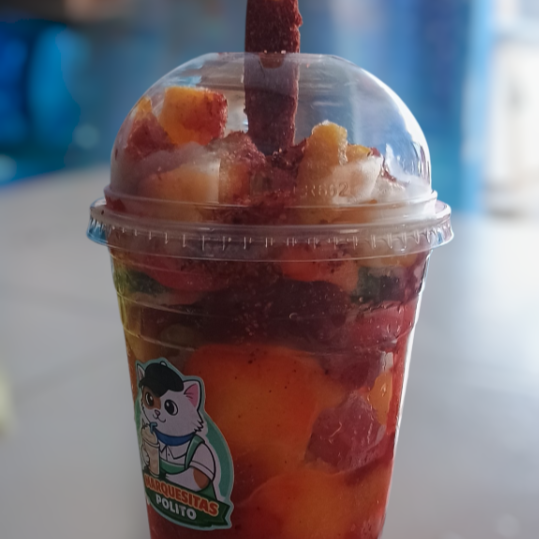Jugo de cajita sabor mango congelado y triturado tipo raspado, bañado con chamoy y espolvoreado con tajín. Servido en vaso de 16 onzas, coronado con gomitas y un rico palito de tamarindo. ✨ Dulce, picosito y súper refrescante. 🔥 ¡El antojo perfecto para el calor!