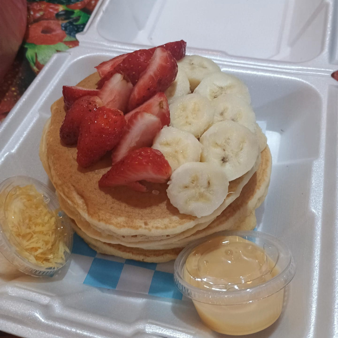 Orden de 4 pz de hotcakes + una fruta a tu eleccion + 2 toppings a escoger