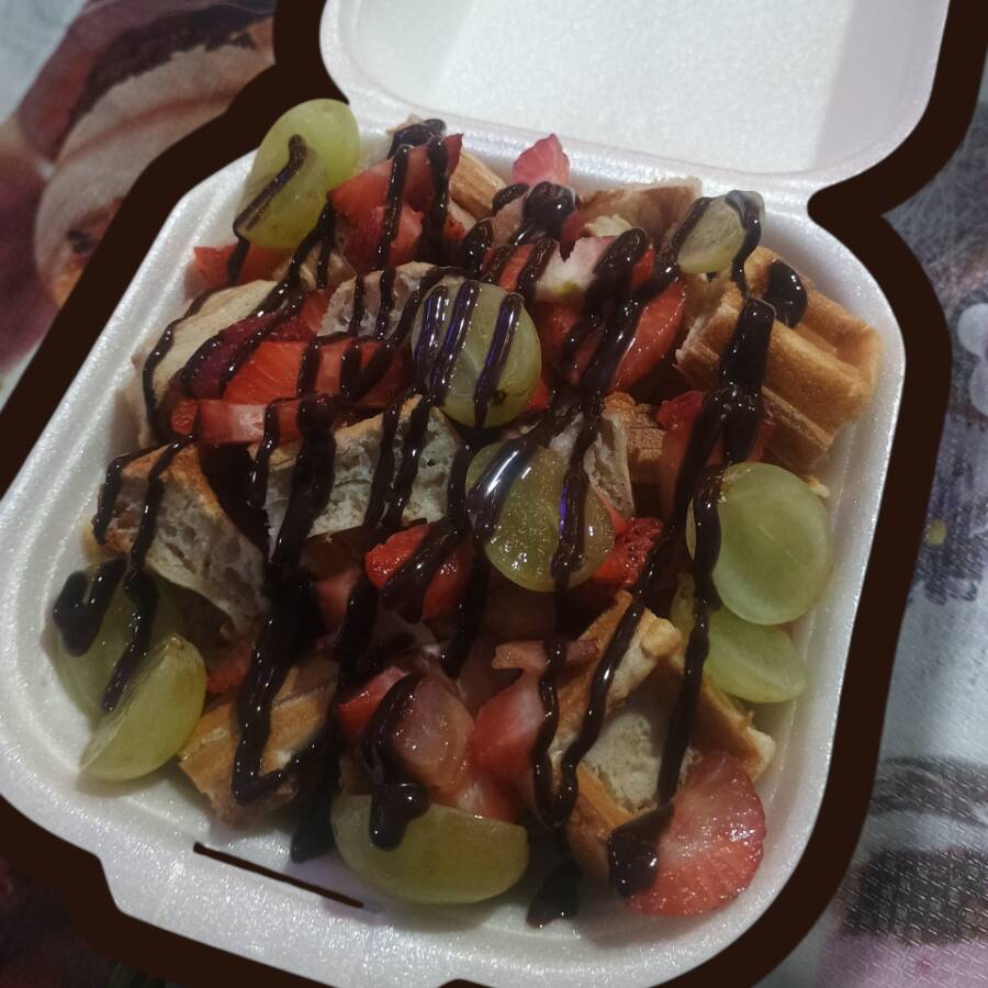 Delicioso Waffle de 20 cm de diámetro divido en dos partes con 2 toppings a elegir + 2 frutas. Armarlo a tu antojo 😋