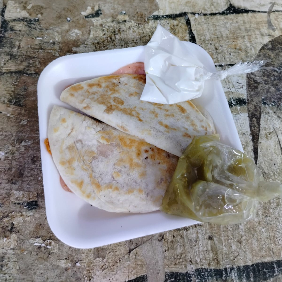 Pollo asado, crema, queso sopero, frijol y salsa verde.