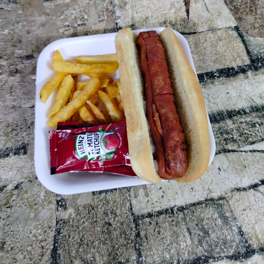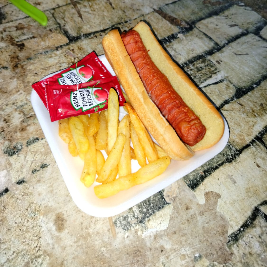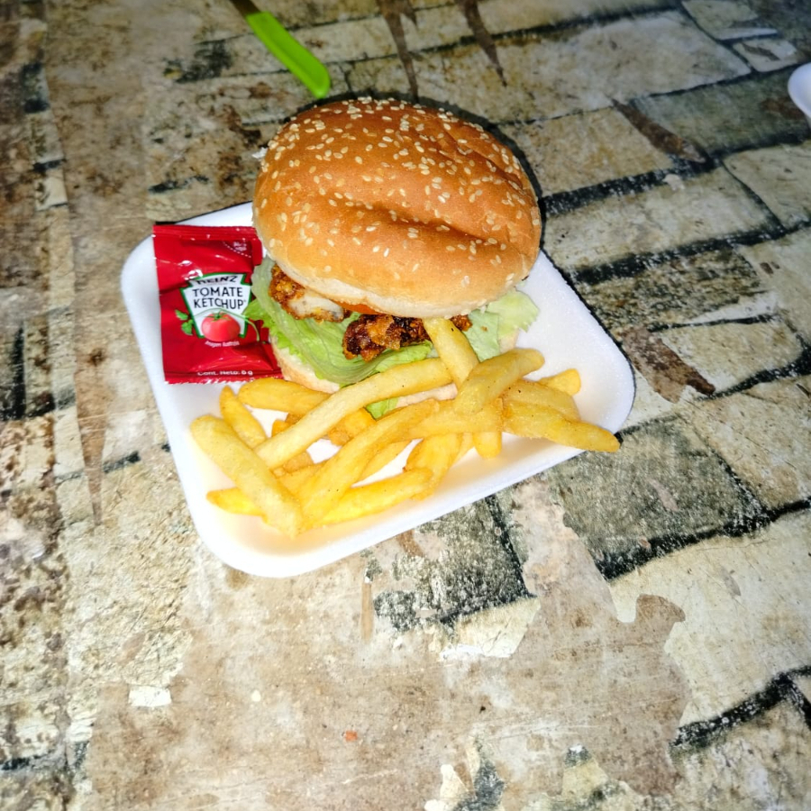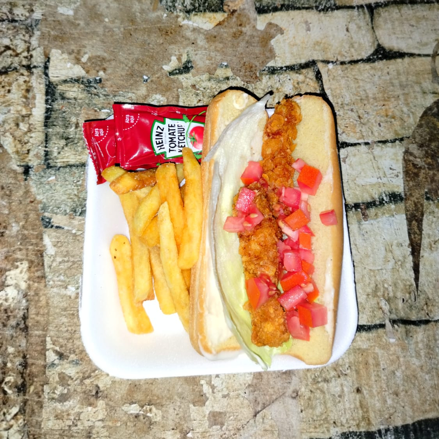 Tiras de pollo empanizado, lechuga, mayonesa, cebolla y tomate, incluye papas.