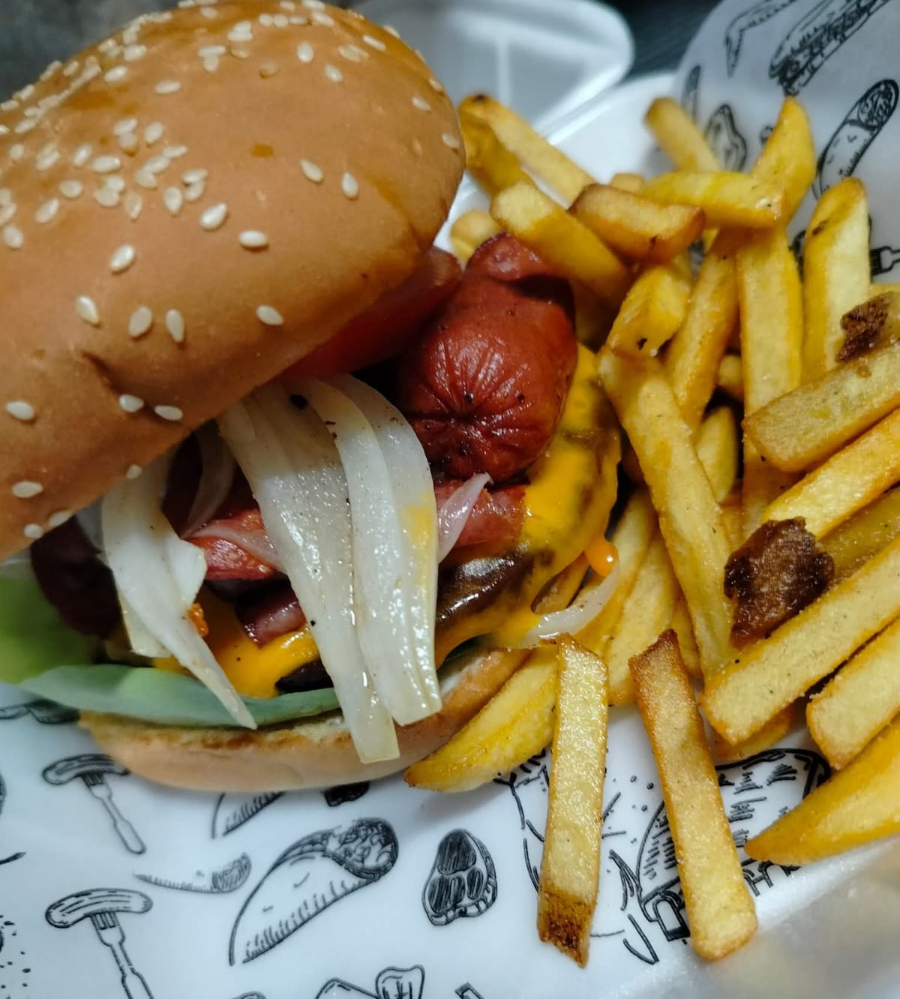 Carne de res, salchicha, queso, lechuga, mayonesa, cebolla y tomate, incluye papas.