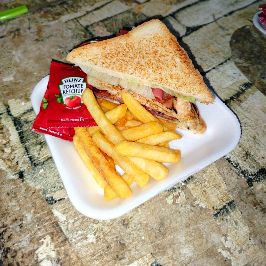 Jamón, pastel pimiento, queso, lechuga, mayonesa y tomate, incluye papas.