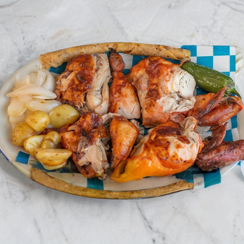 1/2 Delicioso y jugoso pollo rostizado marinado por 24 horas, receta original, acompañado con papas cambray rostizadas espolvoreadas con un "rub" de polvos de la casa, cebollas rostizadas, chile toreado, 200 gr de tortillas y salsa.