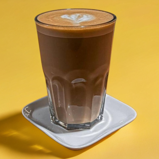 Bebida fría a base de chocolate mamut, espresso y leche deslactosada. 16 oz