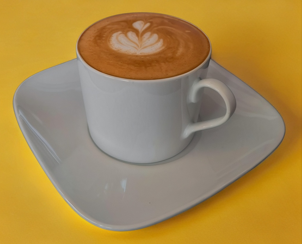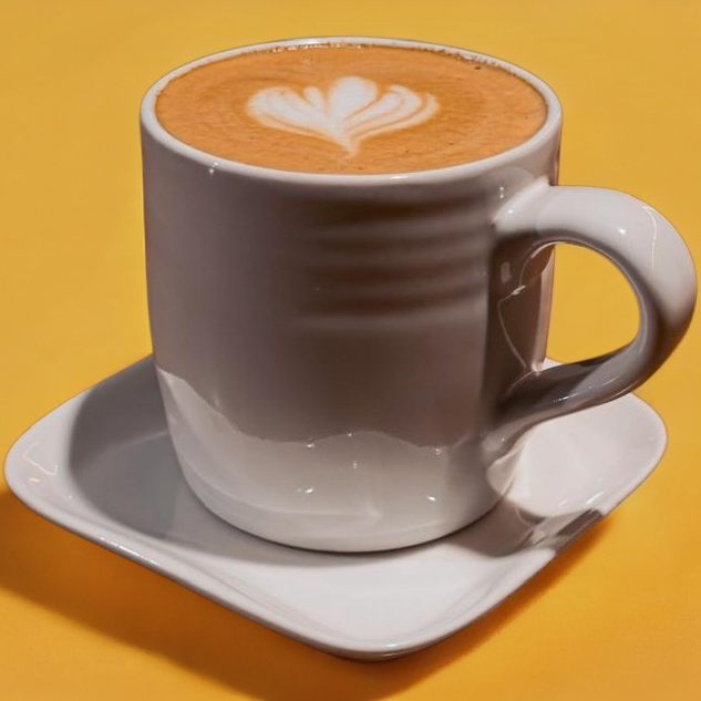 Bebida caliente hecho con doble espresso y leche vaporizada. 10 oz