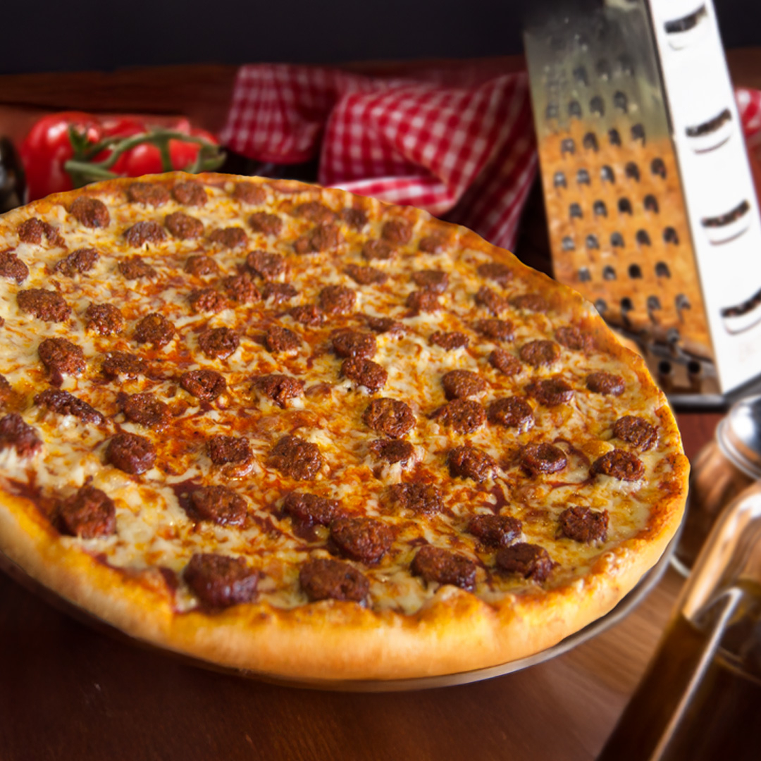 Jamón, salami, salchicha italiana, champiñón, cebolla, pimiento y aceitunas negras. Elige el tamaño de tu preferencia. (ind, ch, m, g).
