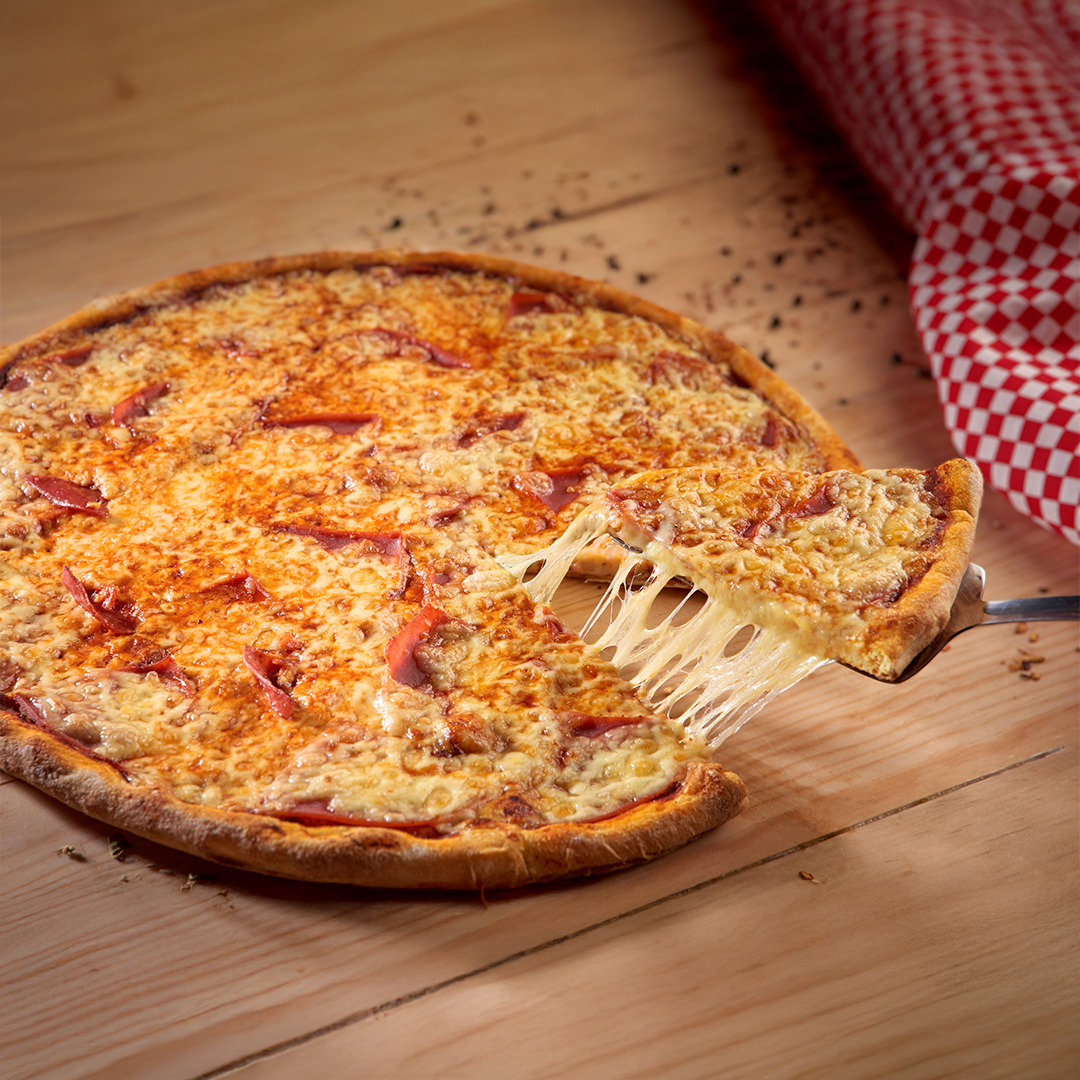 Jamón, salami, champiñones, queso manchego gratinado y nuestra tradicional salsa de tomate con especias.