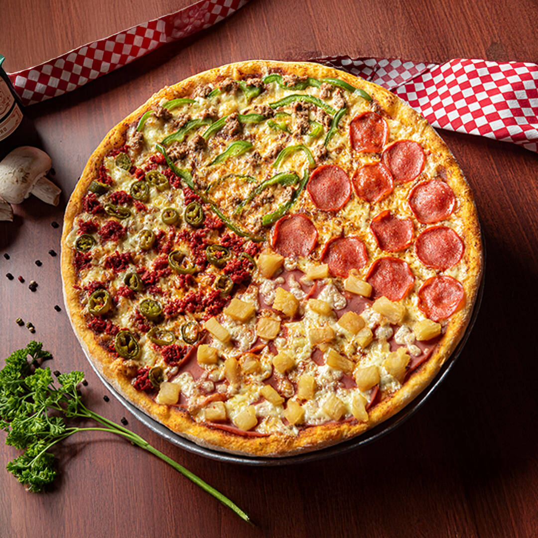 Cuatro sabores en una: salchicha italiana y pimiento, patty´s mexican, hawaiana, pepperoni y queso manchego. Elige el tamaño de tu preferencia. (ch, m, g).