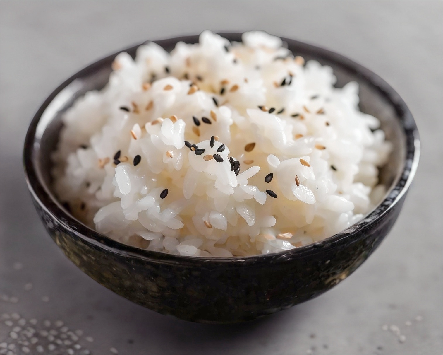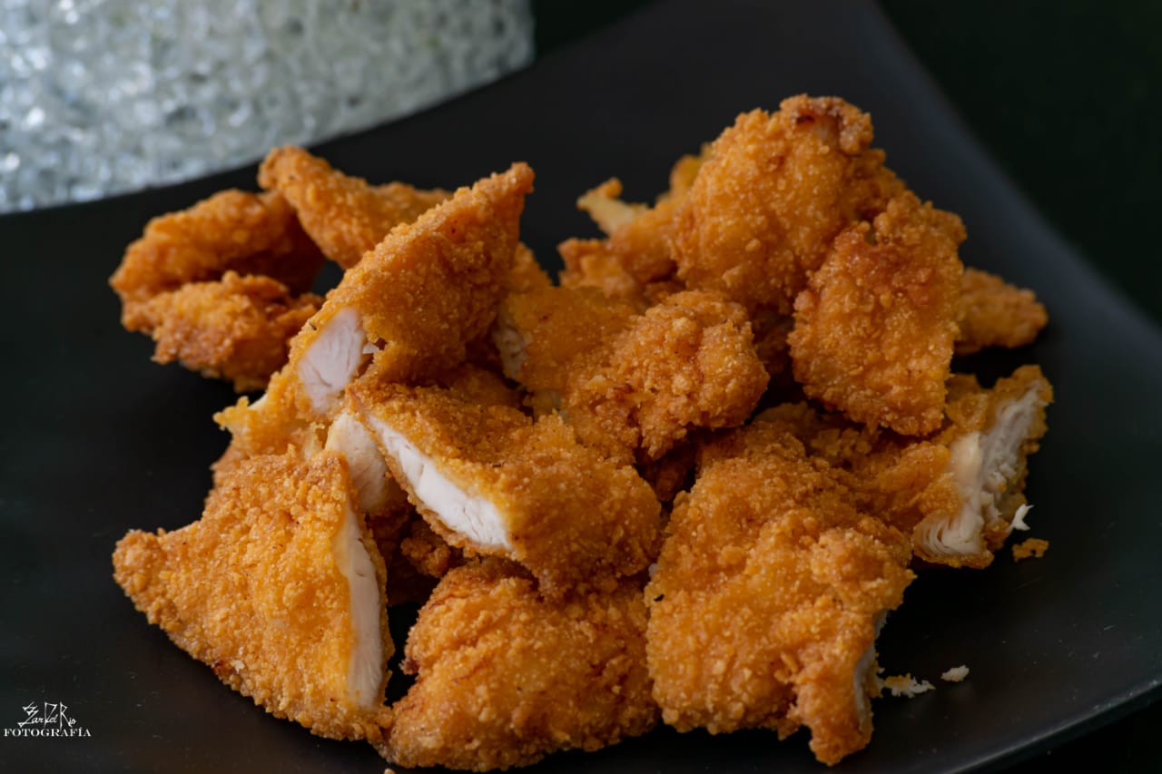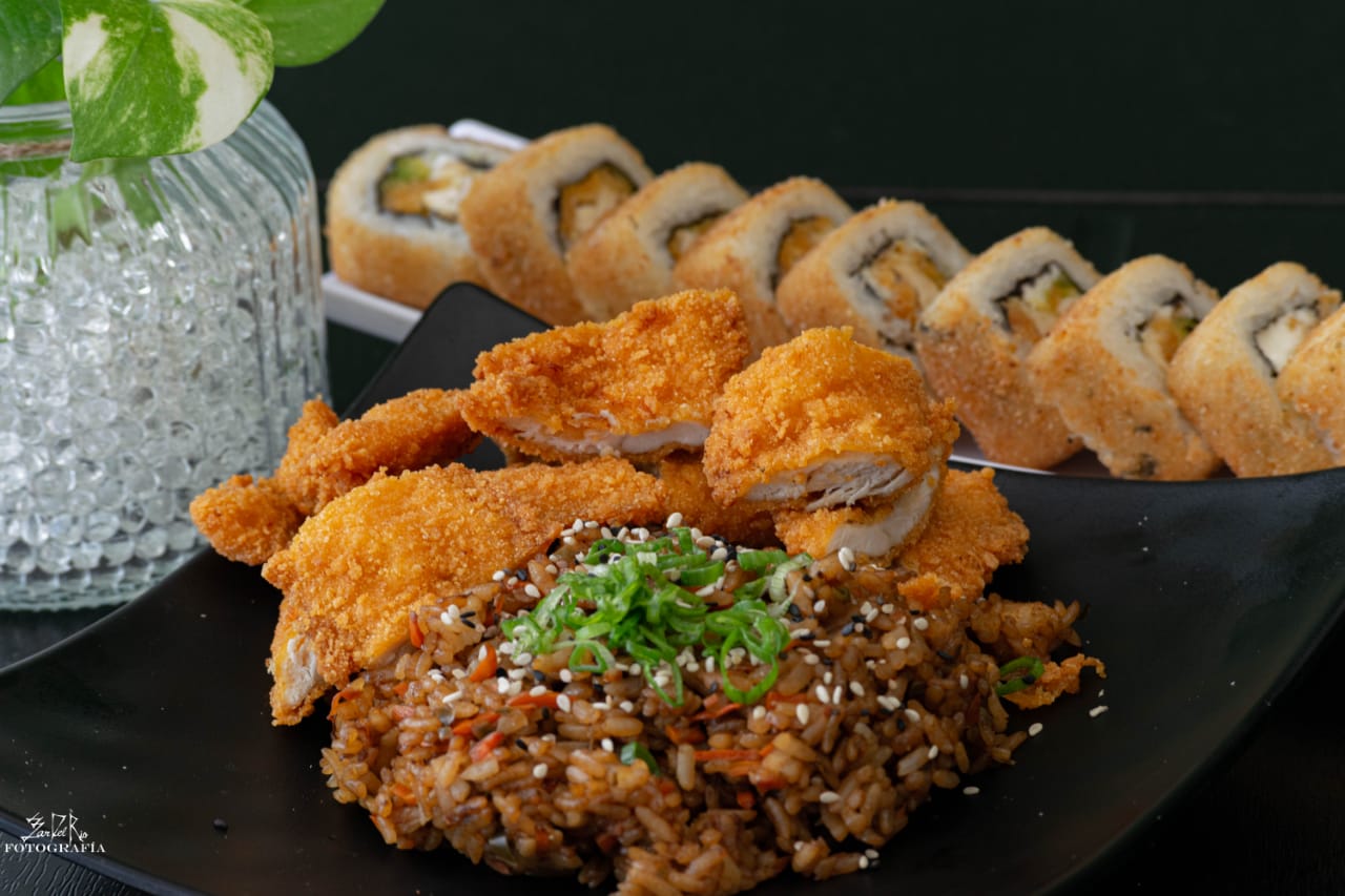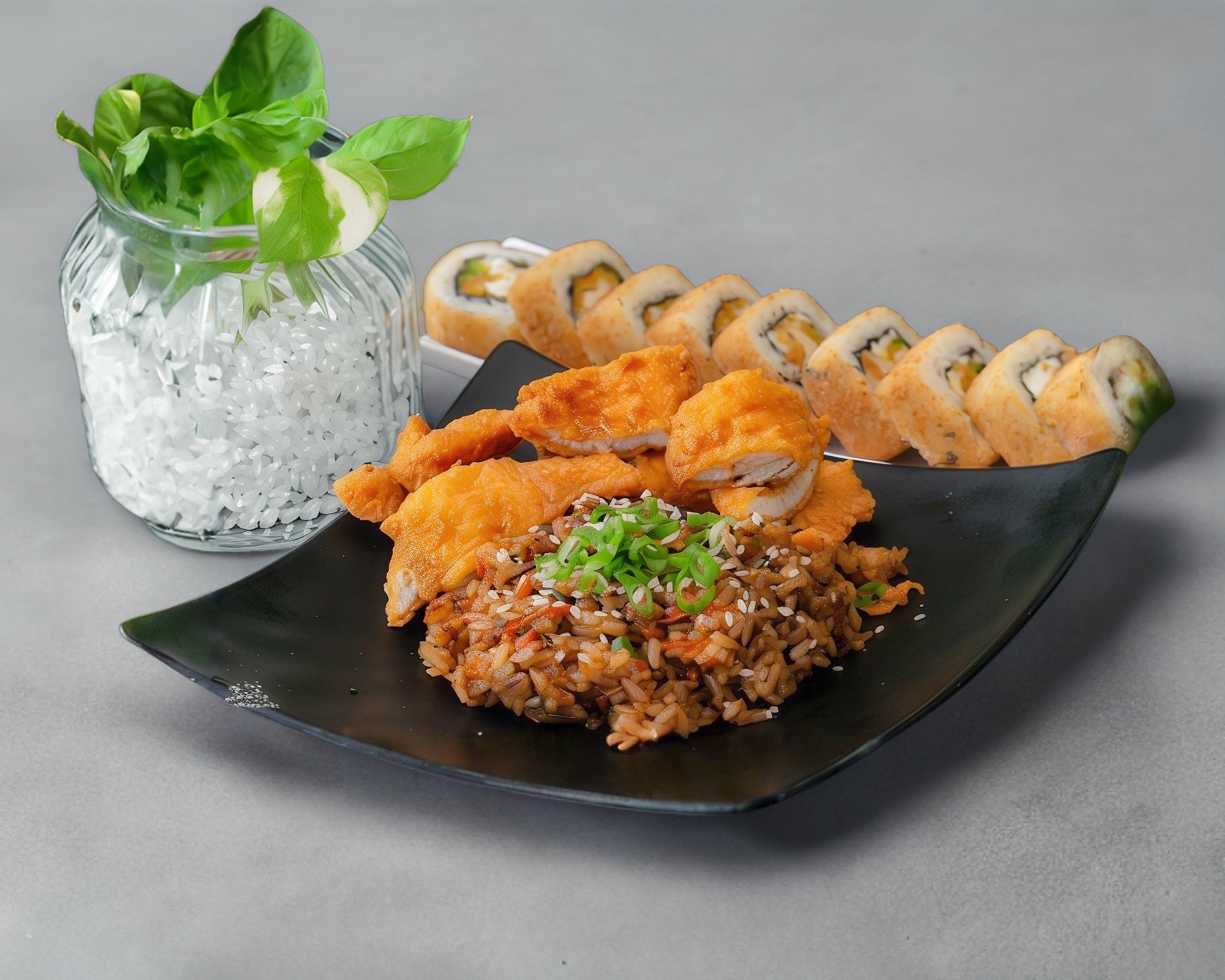 Arroz cocido al vapor mezclado con salsa tampico chipotle. Con pollo crujiente.