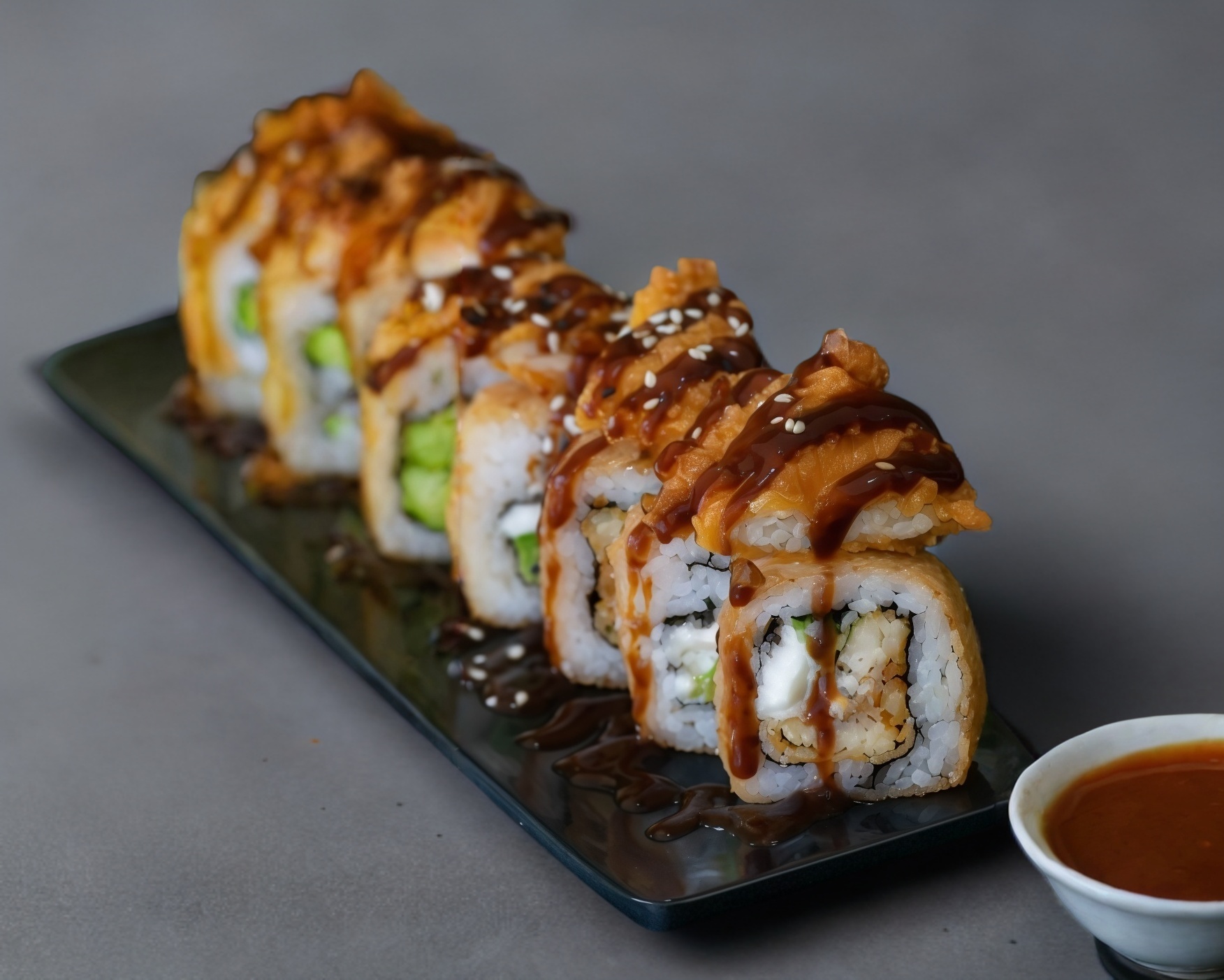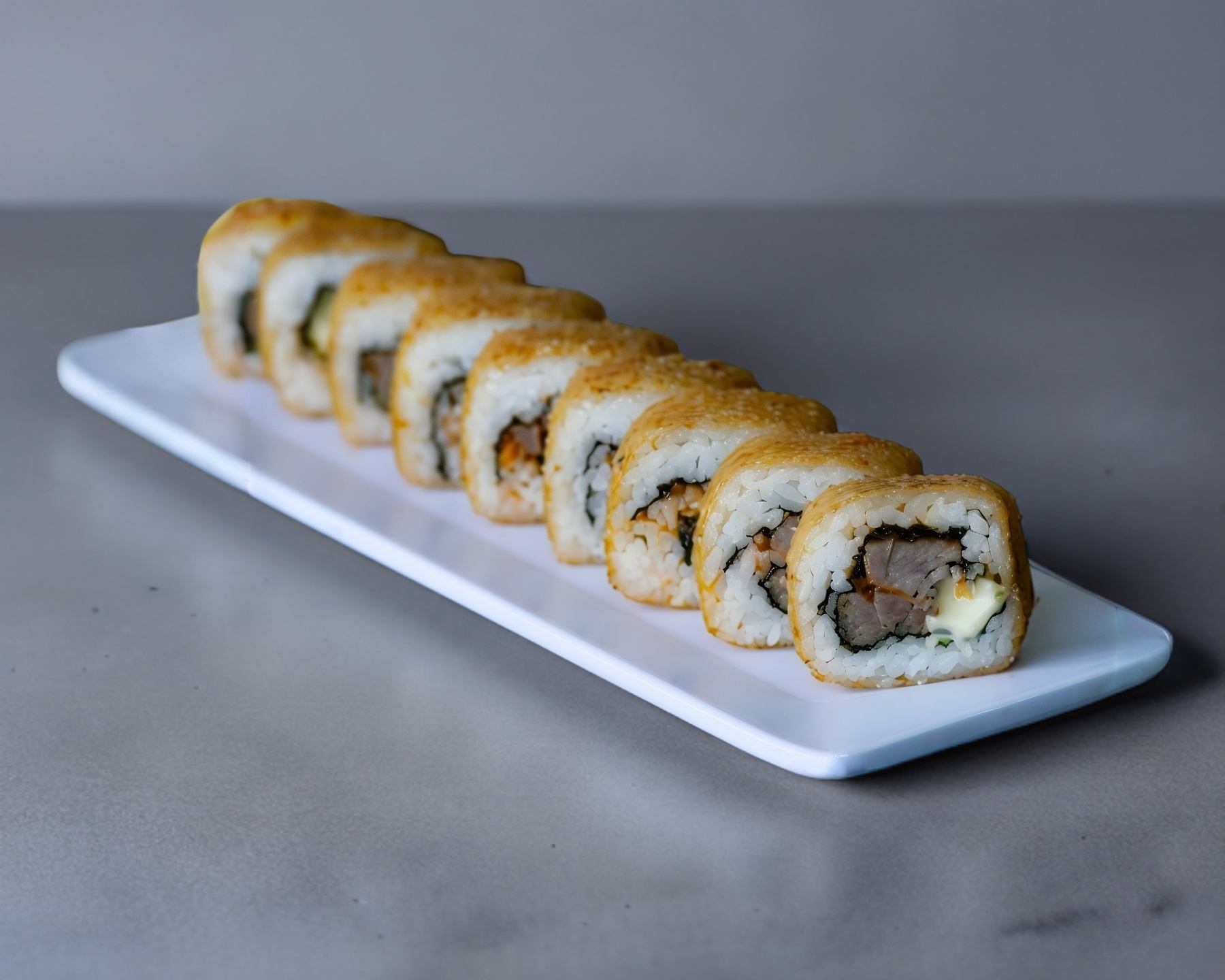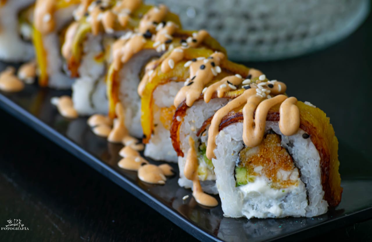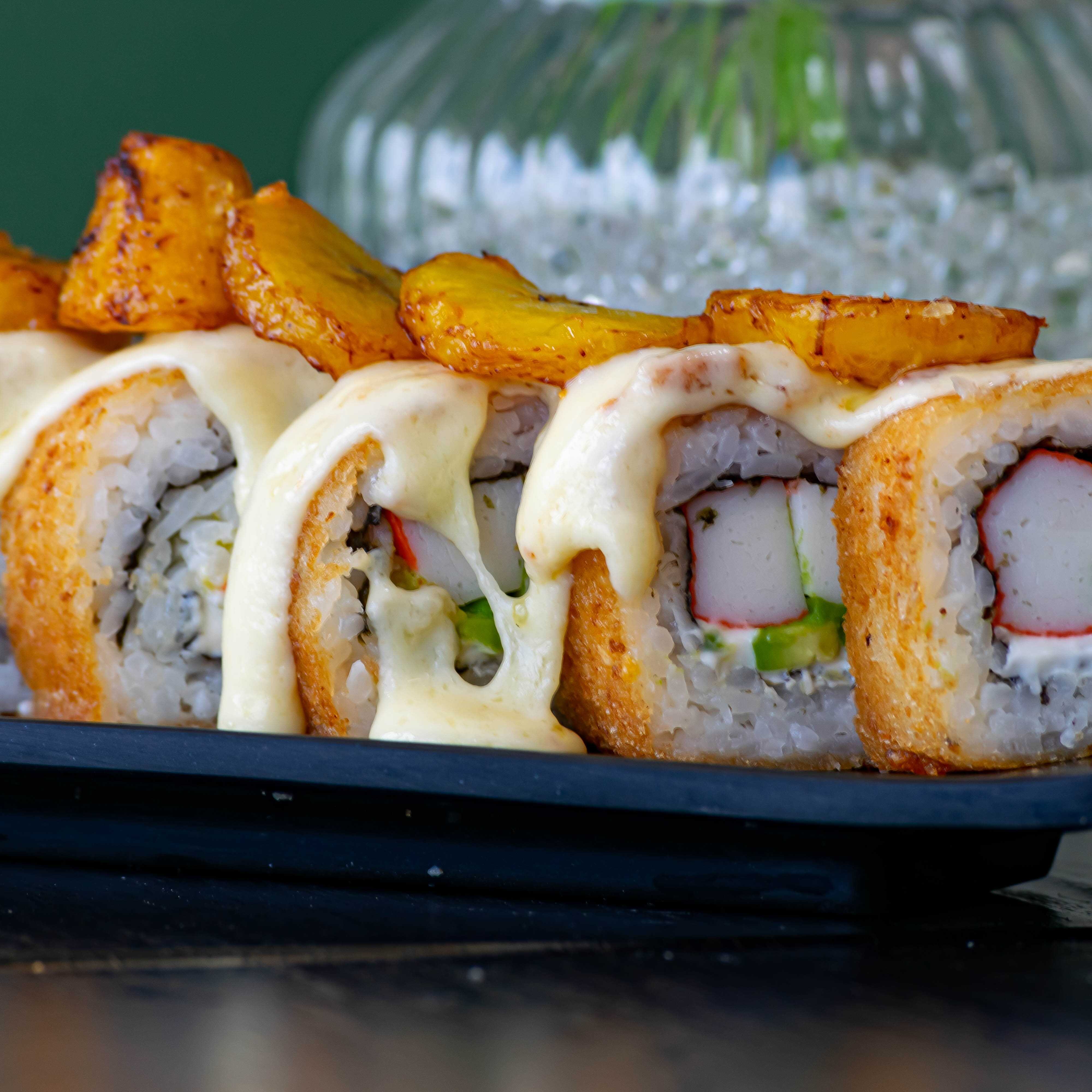 Por dentro, aguacate, Philadelphia, pollo o camarón. Por fuera, plátano frito, crema chipotle y ajonjolí.