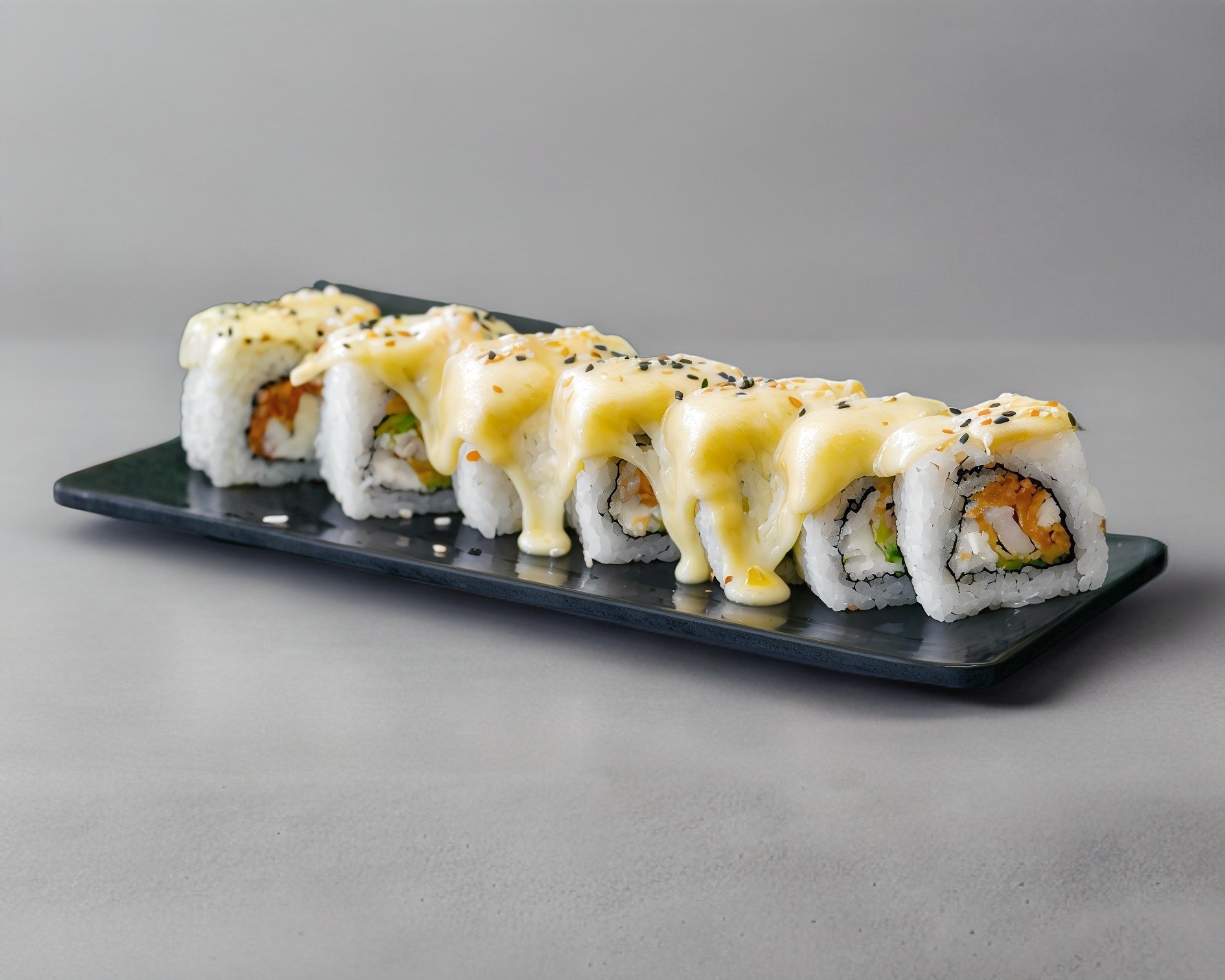 Por dentro, aguacate, Philadelphia, pollo empanizado. Por fuera, champiñones y manchego gratinado.