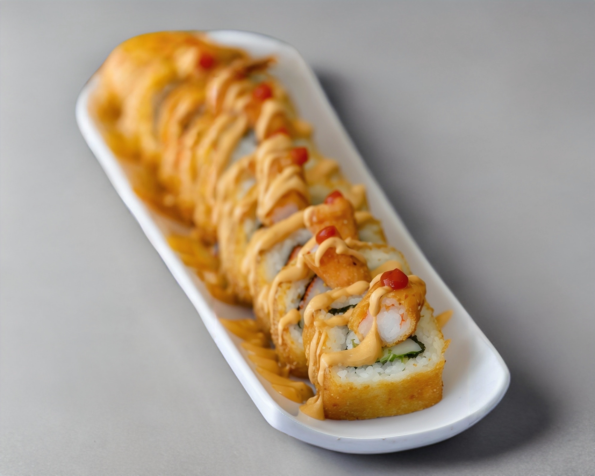 Por dentro, surimi, aguacate y Philadelphia. Por fuera, empanizado, camarones empanizados y crema chipotle.