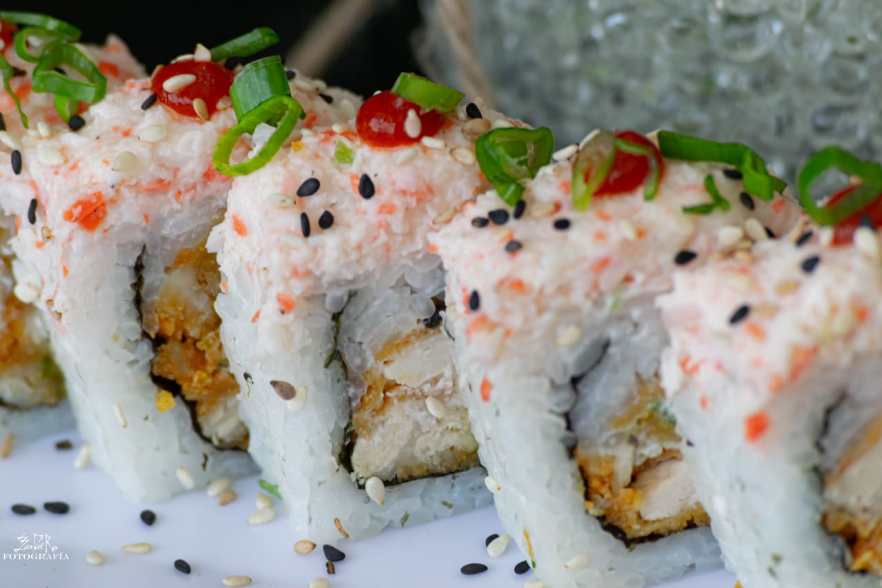 Por dentro, Philadelphia, aguacate y pollo crujiente. Por fuera, salsa tampico, ajonjolí y cebollín.