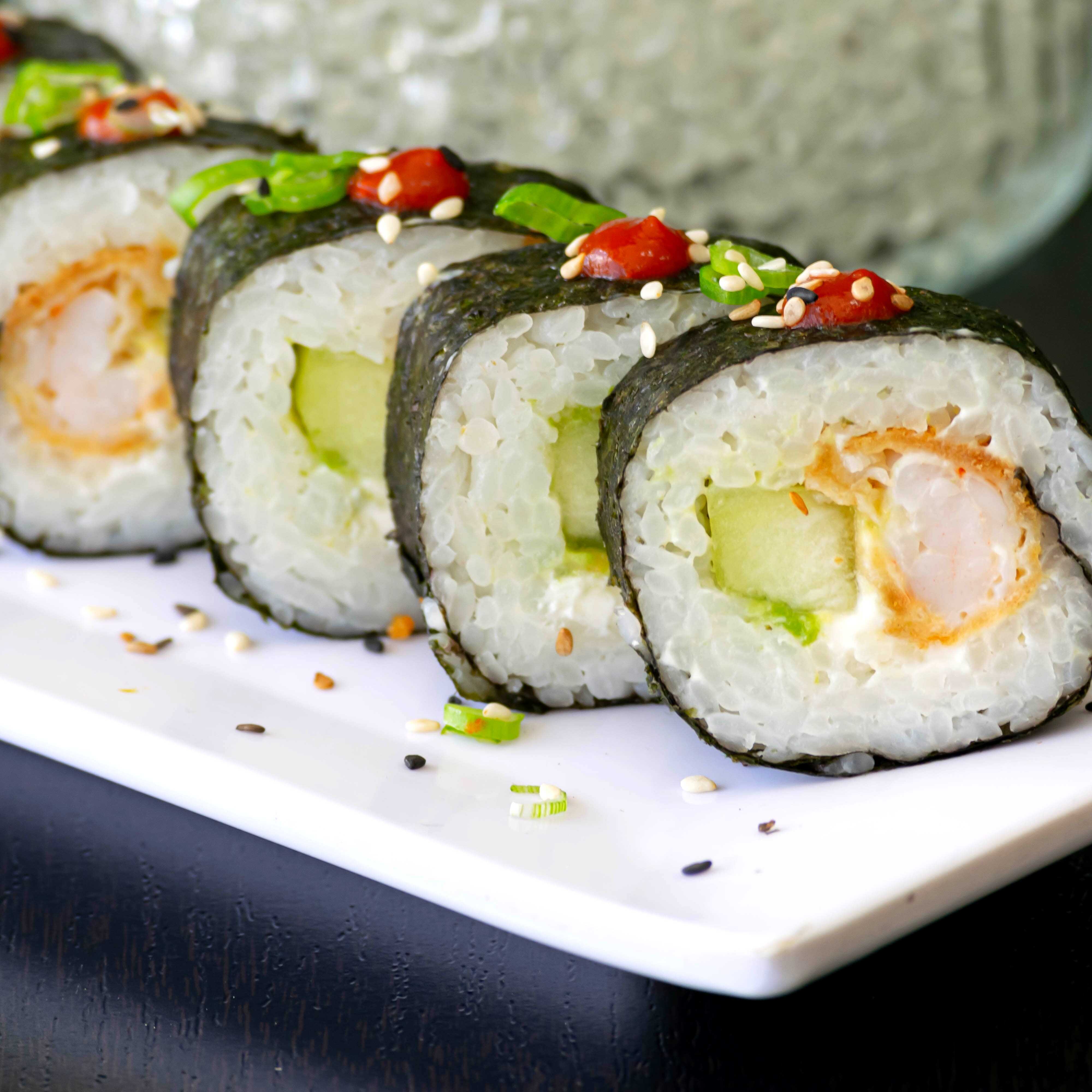 Por dentro, queso crema, pepino, aguacate y camarón empanizado. Por fuera, alga, salsa sriracha y ajonjolí.
