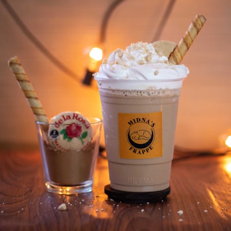 Leche deslactosada, café y crema de chantilly, barquillo con crema de avellanas, 16 oz.