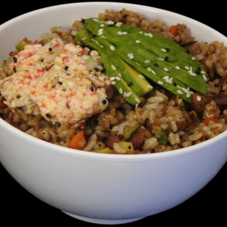 Arroz frito con vegetales, pollo, res, camarón, aguacate, cebolla y aderezo.