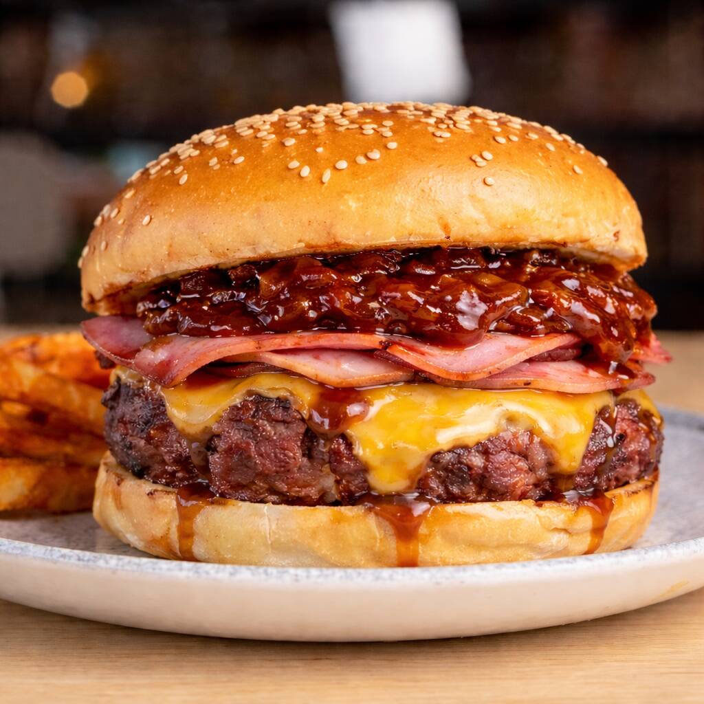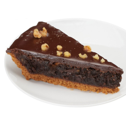 Base de galleta tipo graham, brownie de chocolate espeso, ganache de chocolate y nueces tostadas encima