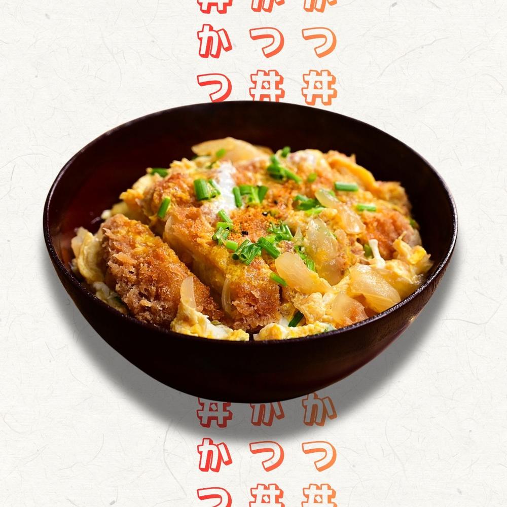 Cerdo empanizado con panko, huevo suave y salsa japonesa con base de soya y cebollas, sobre una cama de arroz al vapor.