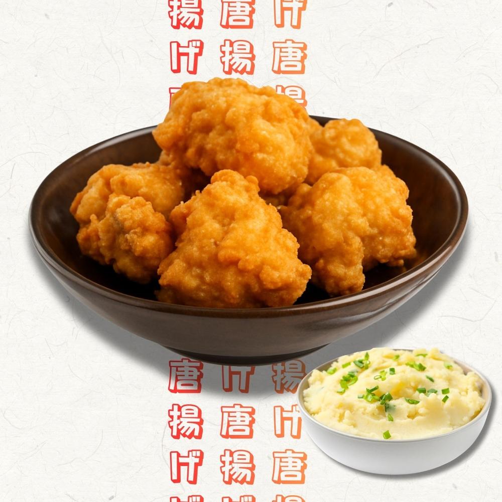 Pollo marinado en sake y frito estilo japonés, crujiente, jugoso y adictivo, acompañado de ensalada de papa tradicional y aderezo de ajonjolí.