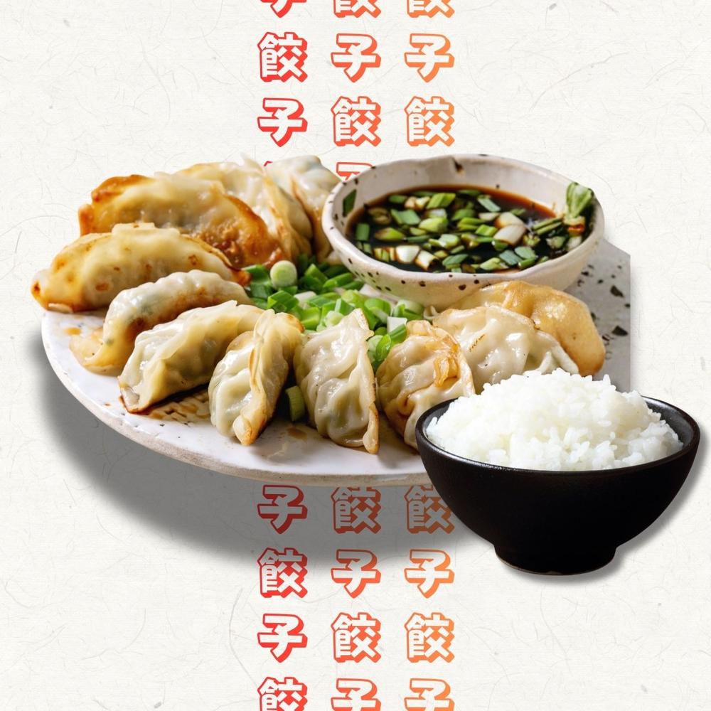 10 Empanaditas japonesas doradas por fuera y jugosas por dentro, rellenas de cerdo y vegetales, acompañadas de arroz al vapor.