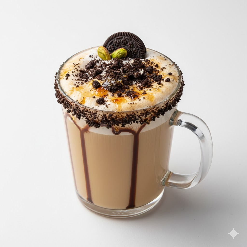Bebida dulce y cremosa con trozos de galleta Oreo y un toque brulee que realza su sabor