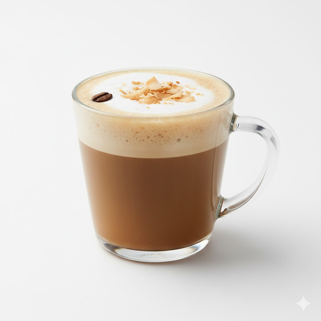 Latte cremoso preparado con café espresso y leche de coco, con un sabor suave, tropical y ligeramente dulce.