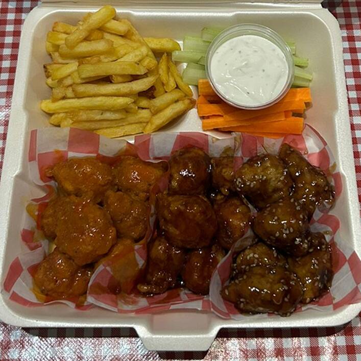 Trozos de pechuga de pollo, capeados y marinados al estilo Cajún. Acompañados con aderezo de tu elección, papas a la francesa y bastones de apio y zanahoria.
