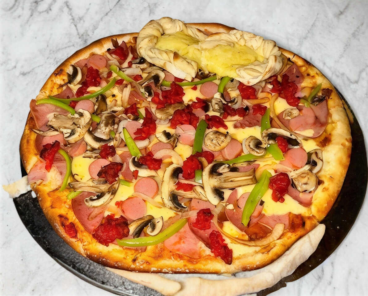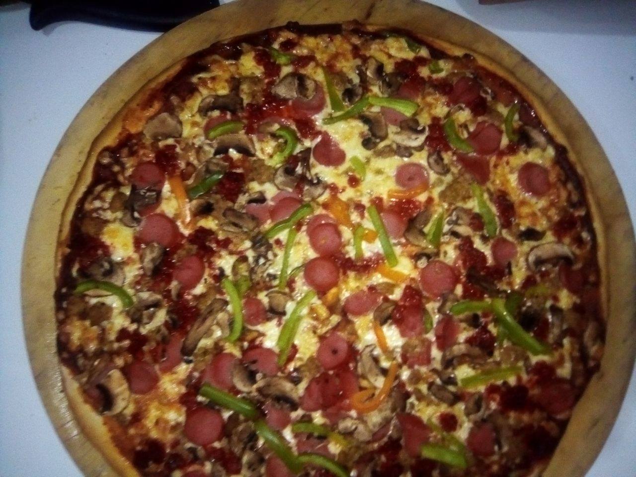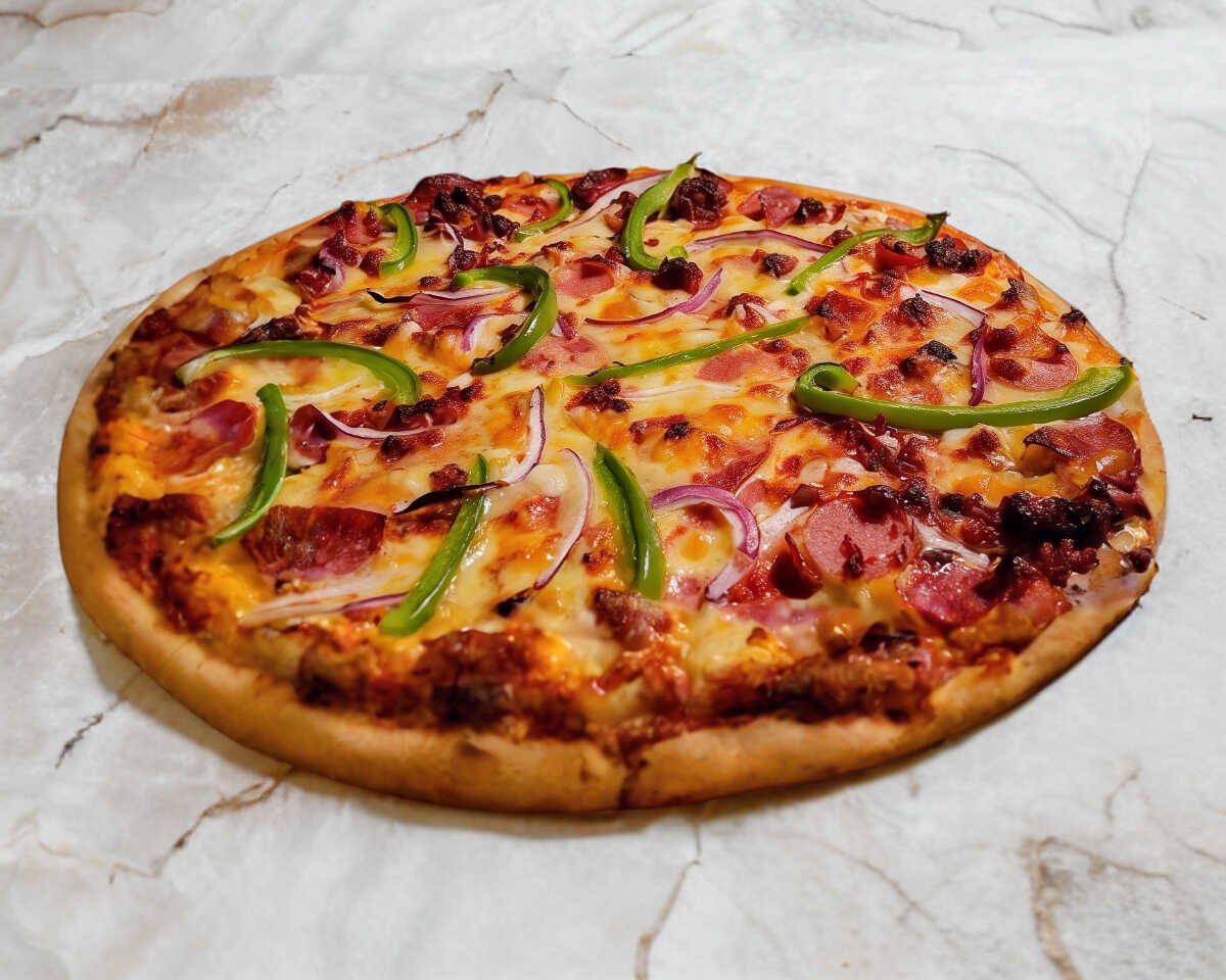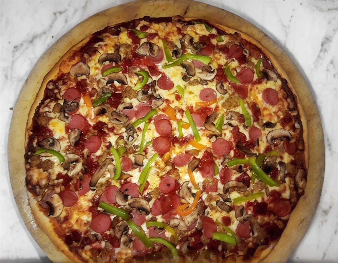 Queso, jamón, salami, chorizo, salchicha de pavo, champiñones, cebolla y pimiento verde.